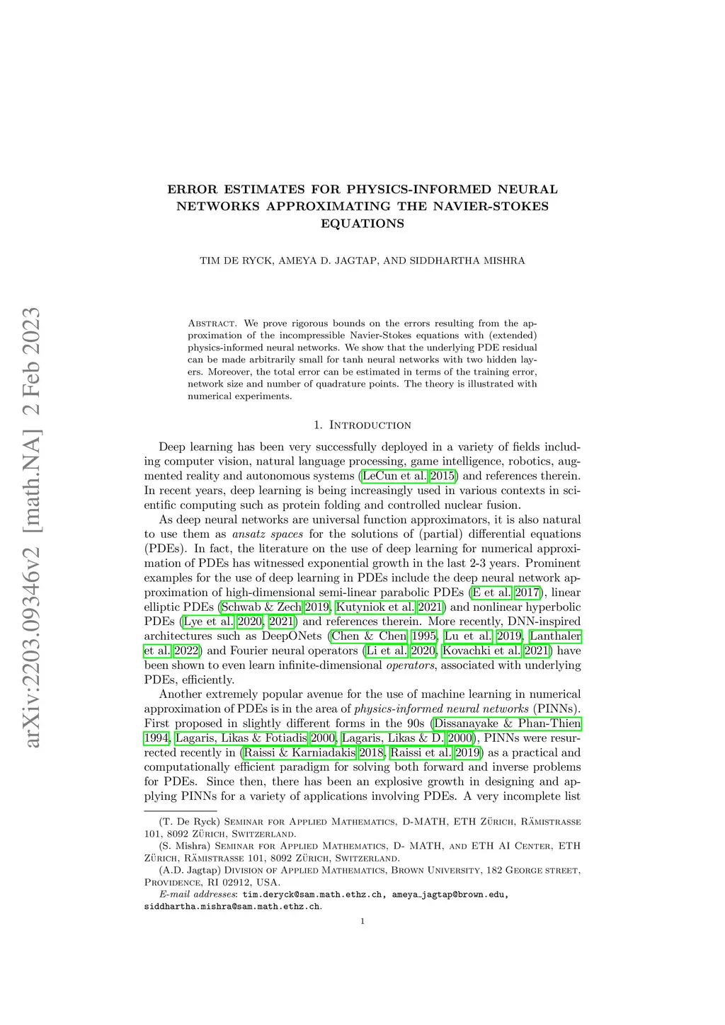 We prove rigorous bounds on the errors resulting from the approximation of the incompressible Navier-Stokes equations with (extended) physics informed neural networks. We show that the underlying PDE residual can be made arbitrarily small for tanh neural networks with two hidden layers. Moreover, the total error can be estimated in terms of the training error, network size and number of quadrature points. The theory is illustrated with numerical experiments.