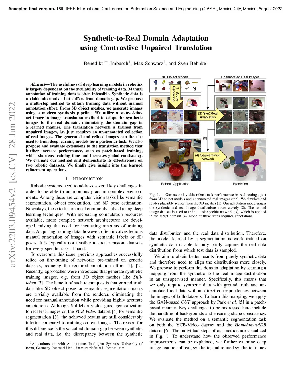The usefulness of deep learning models in robotics is largely dependent on the availability of training data. Manual annotation of training data is often infeasible. Synthetic data is a viable alternative, but suffers from domain gap. We propose a multi-step method to obtain training data without manual annotation effort: From 3D object meshes, we generate images using a modern synthesis pipeline. We utilize a state-of-the-art image-to-image translation method to adapt the synthetic images to the real domain, minimizing the domain gap in a learned manner. The translation network is trained from unpaired images, i.e. just requires an un-annotated collection of real images. The generated and refined images can then be used to train deep learning models for a particular task. We also propose and evaluate extensions to the translation method that further increase performance, such as patch-based training, which shortens training time and increases global consistency. We evaluate our method and demonstrate its effectiveness on two robotic datasets. We finally give insight into the learned refinement operations.
