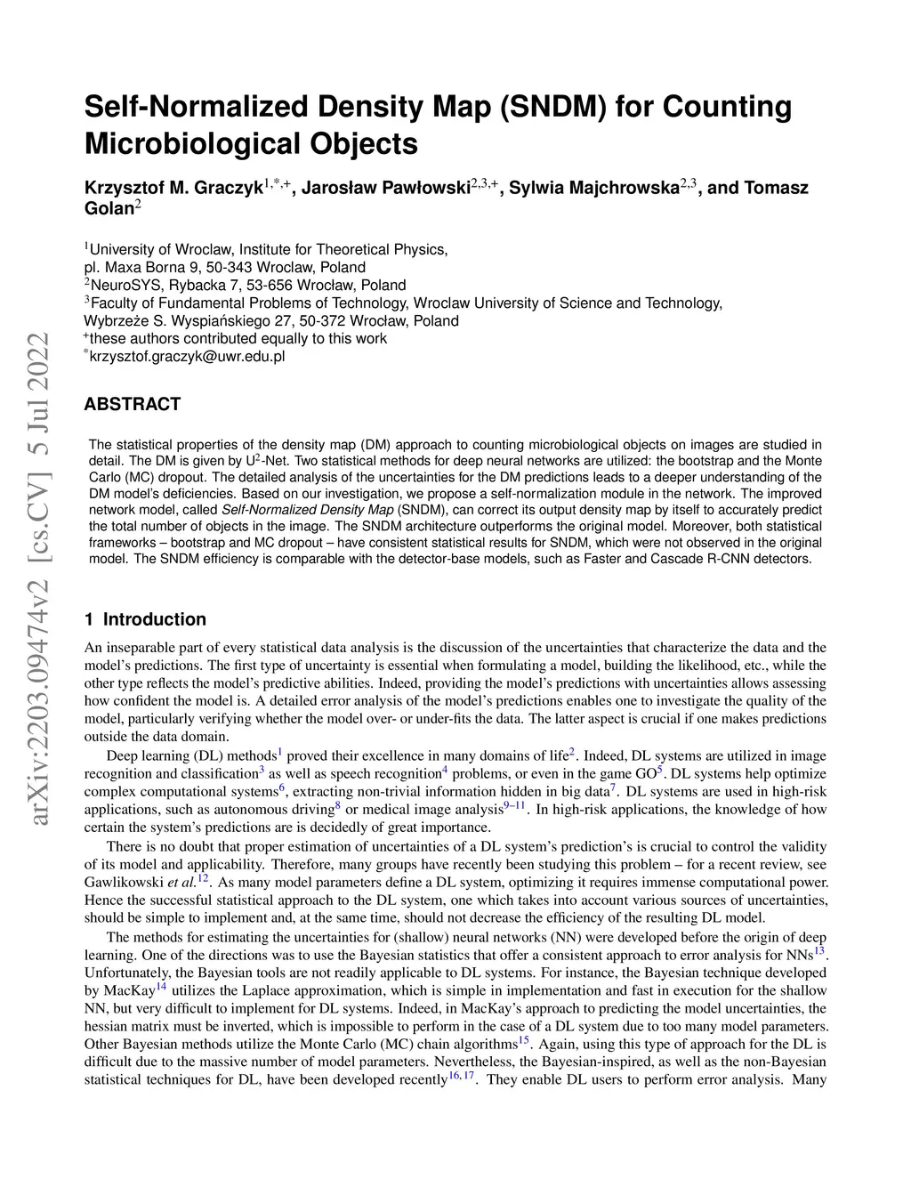 The statistical properties of the density map (DM) approach to counting microbiological objects on images are studied in detail. The DM is given by U-Net. Two statistical methods for deep neural networks are utilized: the bootstrap and the Monte Carlo (MC) dropout. The detailed analysis of the uncertainties for the DM predictions leads to a deeper understanding of the DM model's deficiencies. Based on our investigation, we propose a self-normalization module in the network. The improved network model, called \textit{Self-Normalized Density Map} (SNDM), can correct its output density map by itself to accurately predict the total number of objects in the image. The SNDM architecture outperforms the original model. Moreover, both statistical frameworks -- bootstrap and MC dropout -- have consistent statistical results for SNDM, which were not observed in the original model. The SNDM efficiency is comparable with the detector-base models, such as Faster and Cascade R-CNN detectors.