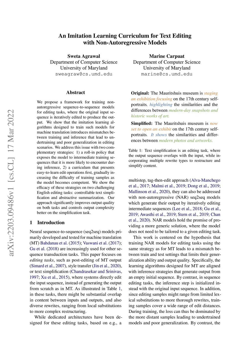 We propose a framework for training non-autoregressive sequence-to-sequence models for editing tasks, where the original input sequence is iteratively edited to produce the output. We show that the imitation learning algorithms designed to train such models for machine translation introduces mismatches between training and inference that lead to undertraining and poor generalization in editing scenarios. We address this issue with two complementary strategies: 1) a roll-in policy that exposes the model to intermediate training sequences that it is more likely to encounter during inference, 2) a curriculum that presents easy-to-learn edit operations first, gradually increasing the difficulty of training samples as the model becomes competent. We show the efficacy of these strategies on two challenging English editing tasks: controllable text simplification and abstractive summarization. Our approach significantly improves output quality on both tasks and controls output complexity better on the simplification task.