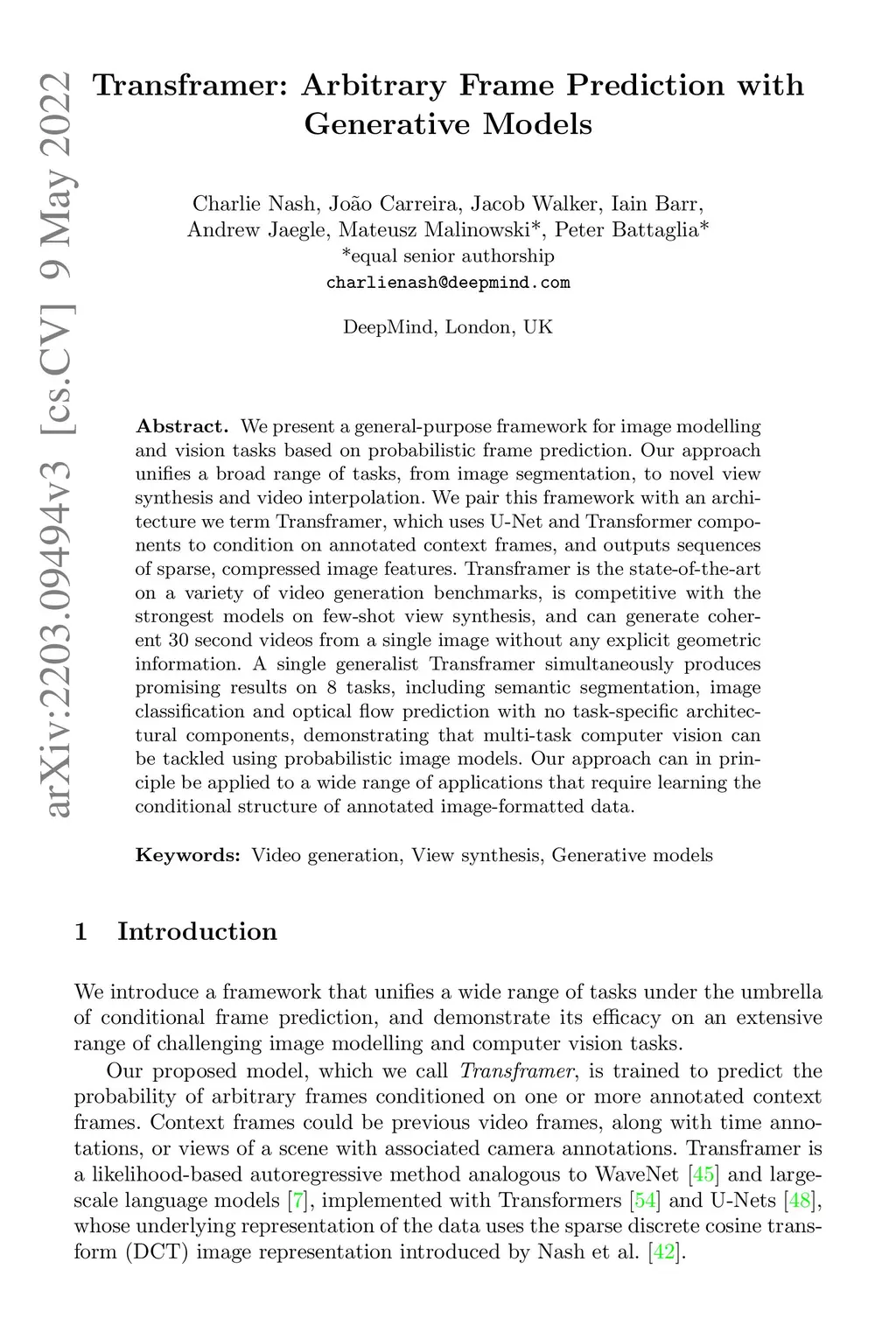 We present a general-purpose framework for image modelling and vision tasks based on probabilistic frame prediction. Our approach unifies a broad range of tasks, from image segmentation, to novel view synthesis and video interpolation. We pair this framework with an architecture we term Transframer, which uses U-Net and Transformer components to condition on annotated context frames, and outputs sequences of sparse, compressed image features. Transframer is the state-of-the-art on a variety of video generation benchmarks, is competitive with the strongest models on few-shot view synthesis, and can generate coherent 30 second videos from a single image without any explicit geometric information. A single generalist Transframer simultaneously produces promising results on 8 tasks, including semantic segmentation, image classification and optical flow prediction with no task-specific architectural components, demonstrating that multi-task computer vision can be tackled using probabilistic image models. Our approach can in principle be applied to a wide range of applications that require learning the conditional structure of annotated image-formatted data.