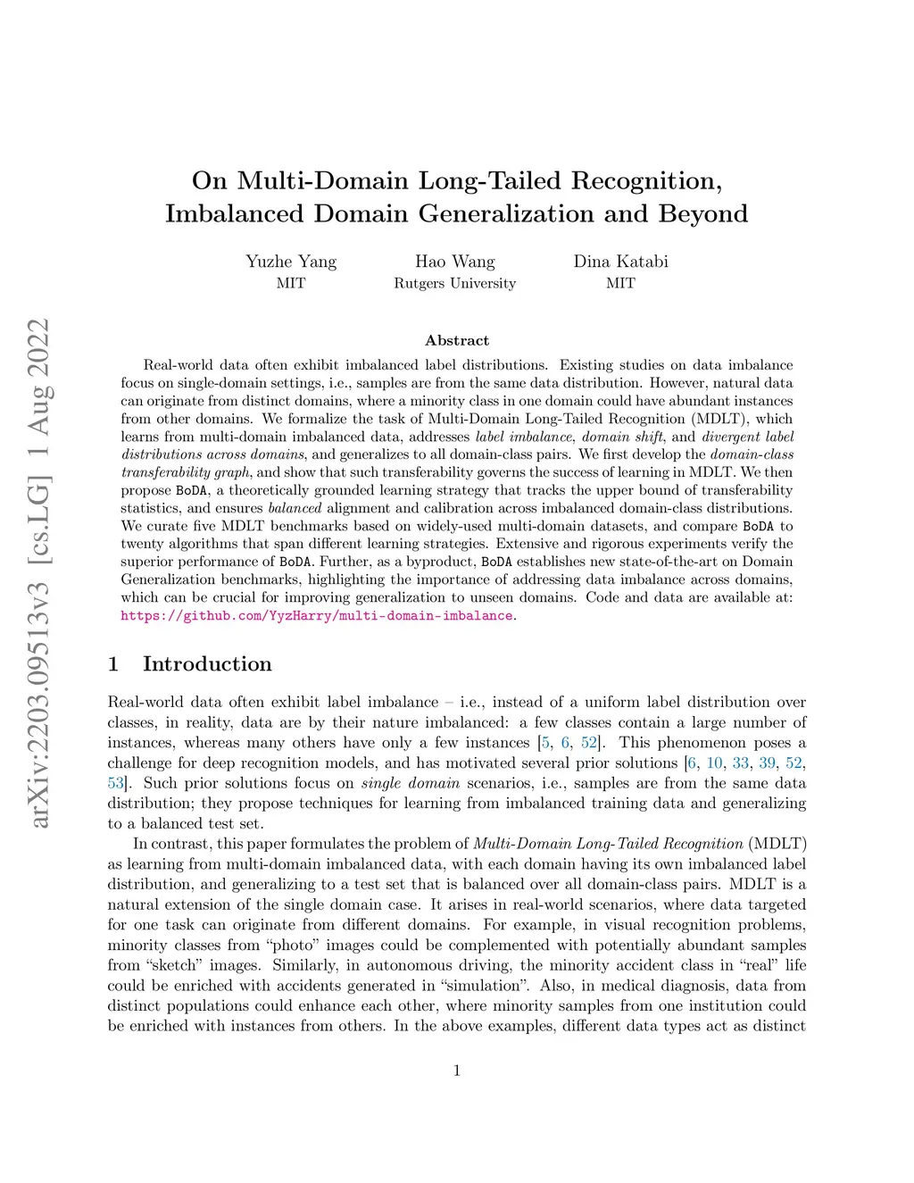 Real-world data often exhibit imbalanced label distributions. Existing studies on data imbalance focus on single-domain settings, i.e., samples are from the same data distribution. However, natural data can originate from distinct domains, where a minority class in one domain could have abundant instances from other domains. We formalize the task of Multi-Domain Long-Tailed Recognition (MDLT), which learns from multi-domain imbalanced data, addresses label imbalance, domain shift, and divergent label distributions across domains, and generalizes to all domain-class pairs. We first develop the domain-class transferability graph, and show that such transferability governs the success of learning in MDLT. We then propose BoDA, a theoretically grounded learning strategy that tracks the upper bound of transferability statistics, and ensures balanced alignment and calibration across imbalanced domain-class distributions. We curate five MDLT benchmarks based on widely-used multi-domain datasets, and compare BoDA to twenty algorithms that span different learning strategies. Extensive and rigorous experiments verify the superior performance of BoDA. Further, as a byproduct, BoDA establishes new state-of-the-art on Domain Generalization benchmarks, highlighting the importance of addressing data imbalance across domains, which can be crucial for improving generalization to unseen domains. Code and data are available at: https://github.com/YyzHarry/multi-domain-imbalance.