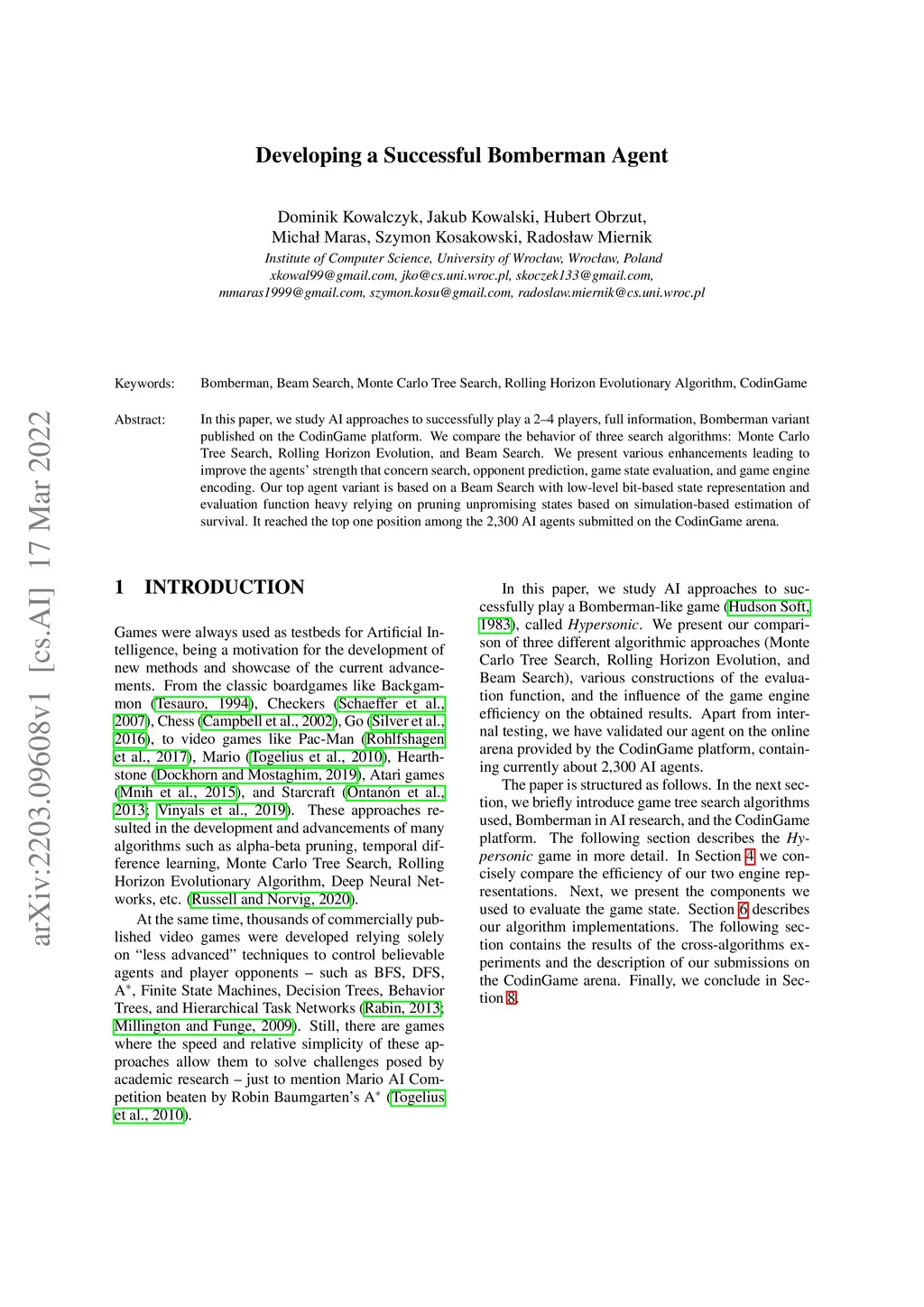 In this paper, we study AI approaches to successfully play a 2-4 players, full information, Bomberman variant published on the CodinGame platform. We compare the behavior of three search algorithms: Monte Carlo Tree Search, Rolling Horizon Evolution, and Beam Search. We present various enhancements leading to improve the agents' strength that concern search, opponent prediction, game state evaluation, and game engine encoding. Our top agent variant is based on a Beam Search with low-level bit-based state representation and evaluation function heavy relying on pruning unpromising states based on simulation-based estimation of survival. It reached the top one position among the 2,300 AI agents submitted on the CodinGame arena.