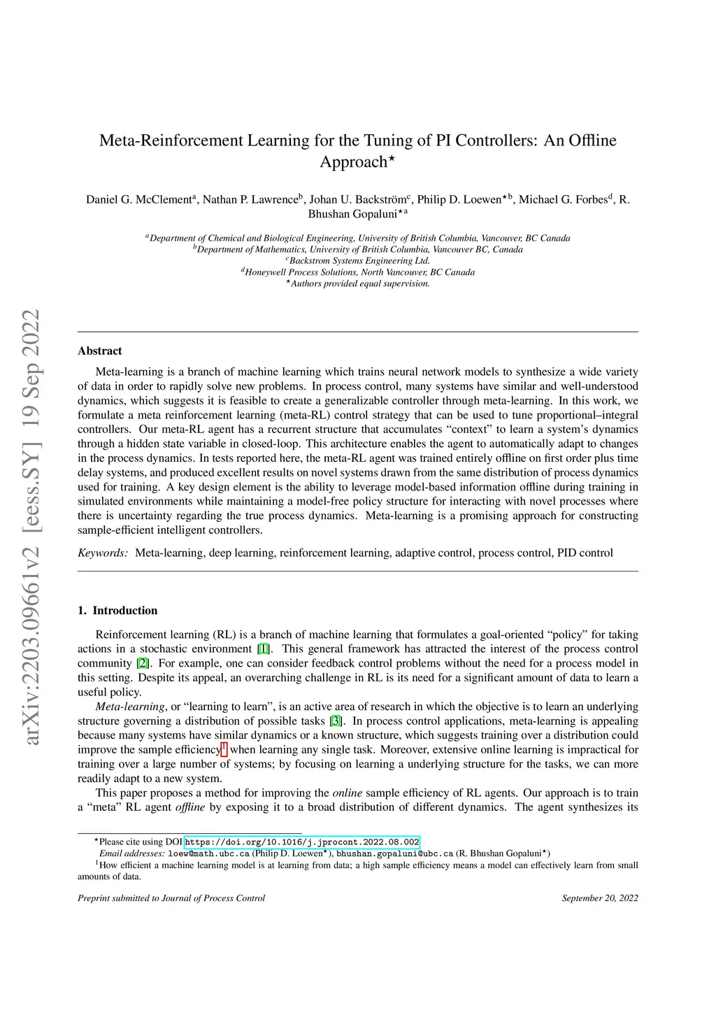 Meta-learning is a branch of machine learning which trains neural network models to synthesize a wide variety of data in order to rapidly solve new problems. In process control, many systems have similar and well-understood dynamics, which suggests it is feasible to create a generalizable controller through meta-learning. In this work, we formulate a meta reinforcement learning (meta-RL) control strategy that can be used to tune proportional--integral controllers. Our meta-RL agent has a recurrent structure that accumulates "context" to learn a system's dynamics through a hidden state variable in closed-loop. This architecture enables the agent to automatically adapt to changes in the process dynamics. In tests reported here, the meta-RL agent was trained entirely offline on first order plus time delay systems, and produced excellent results on novel systems drawn from the same distribution of process dynamics used for training. A key design element is the ability to leverage model-based information offline during training in simulated environments while maintaining a model-free policy structure for interacting with novel processes where there is uncertainty regarding the true process dynamics. Meta-learning is a promising approach for constructing sample-efficient intelligent controllers.