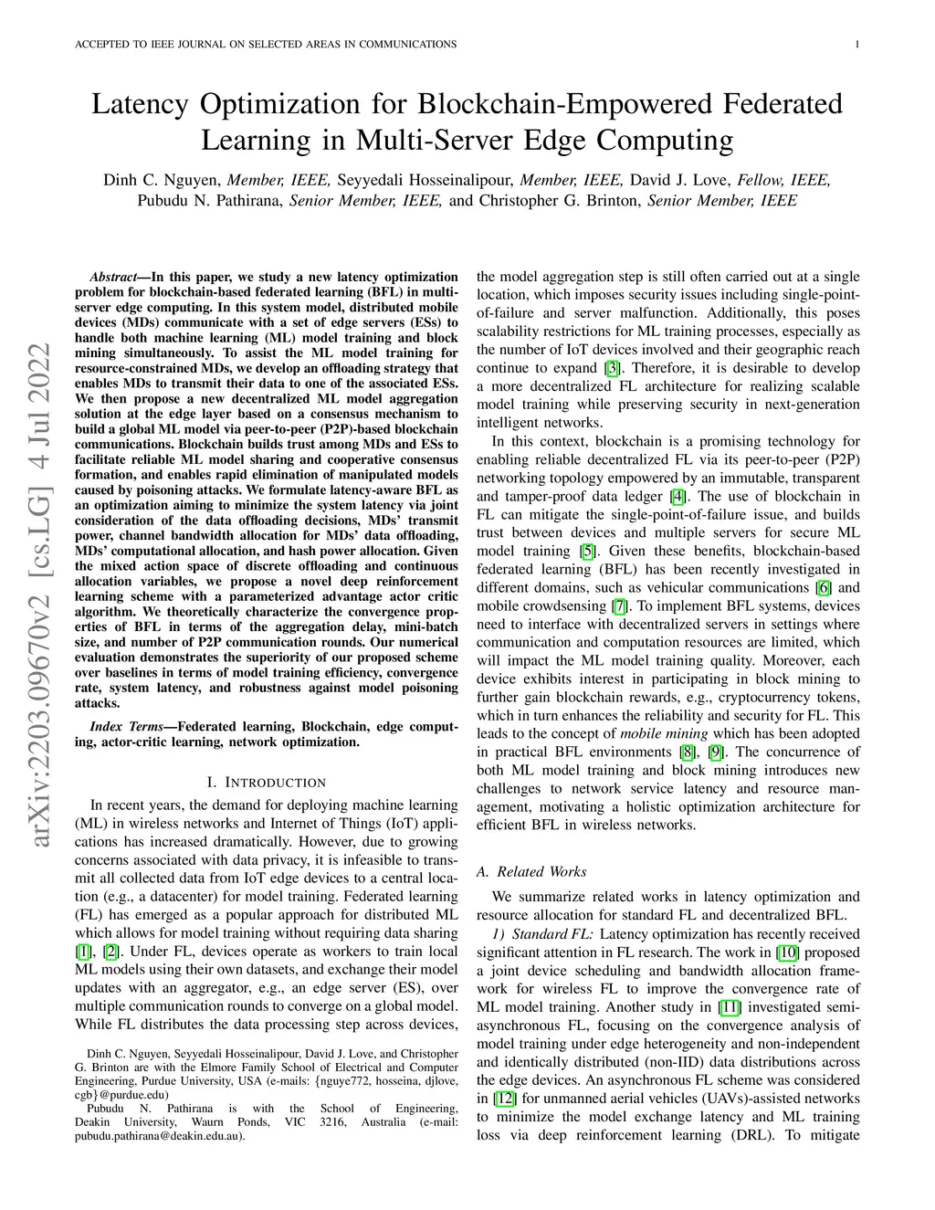 In this paper, we study a new latency optimization problem for blockchain-based federated learning (BFL) in multi-server edge computing. In this system model, distributed mobile devices (MDs) communicate with a set of edge servers (ESs) to handle both machine learning (ML) model training and block mining simultaneously. To assist the ML model training for resource-constrained MDs, we develop an offloading strategy that enables MDs to transmit their data to one of the associated ESs. We then propose a new decentralized ML model aggregation solution at the edge layer based on a consensus mechanism to build a global ML model via peer-to-peer (P2P)-based blockchain communications. Blockchain builds trust among MDs and ESs to facilitate reliable ML model sharing and cooperative consensus formation, and enables rapid elimination of manipulated models caused by poisoning attacks. We formulate latency-aware BFL as an optimization aiming to minimize the system latency via joint consideration of the data offloading decisions, MDs' transmit power, channel bandwidth allocation for MDs' data offloading, MDs' computational allocation, and hash power allocation. Given the mixed action space of discrete offloading and continuous allocation variables, we propose a novel deep reinforcement learning scheme with a parameterized advantage actor critic algorithm. We theoretically characterize the convergence properties of BFL in terms of the aggregation delay, mini-batch size, and number of P2P communication rounds. Our numerical evaluation demonstrates the superiority of our proposed scheme over baselines in terms of model training efficiency, convergence rate, system latency, and robustness against model poisoning attacks.