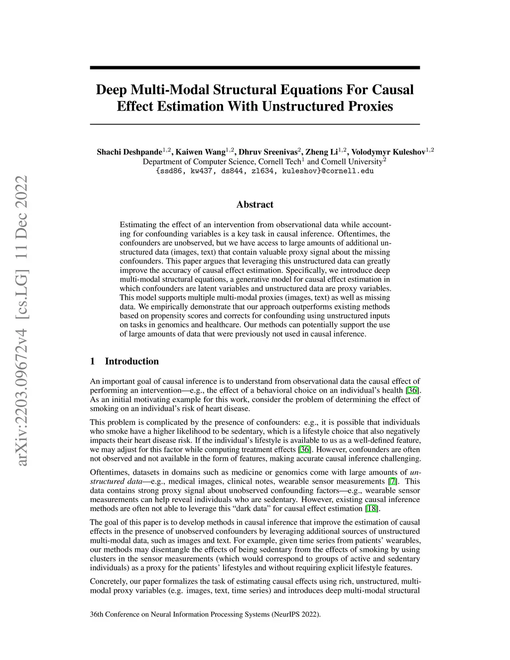 Estimating the effect of an intervention while accounting for confounding variables is a key task in causal inference. Oftentimes, the confounders are unobserved, but we have access to large amounts of unstructured data (images, text) that contain valuable proxy signal about the missing confounders. This paper demonstrates that leveraging unstructured data that is often left unused by existing algorithms improves the accuracy of causal effect estimation. Specifically, we introduce deep multi-modal structural equations, a generative model in which confounders are latent variables and unstructured data are proxy variables. This model supports multiple multi-modal proxies (images, text) as well as missing data. We empirically demonstrate on tasks in genomics and healthcare that our approach corrects for confounding using unstructured inputs, potentially enabling the use of large amounts of data that were previously not used in causal inference.