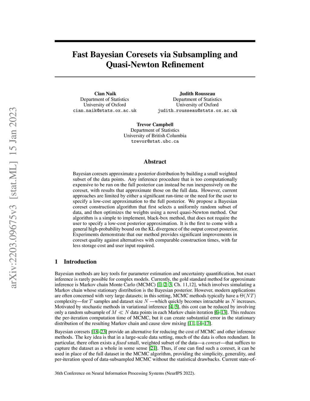 Bayesian coresets approximate a posterior distribution by building a small weighted subset of the data points. Any inference procedure that is too computationally expensive to be run on the full posterior can instead be run inexpensively on the coreset, with results that approximate those on the full data. However, current approaches are limited by either a significant run-time or the need for the user to specify a low-cost approximation to the full posterior. We propose a Bayesian coreset construction algorithm that first selects a uniformly random subset of data, and then optimizes the weights using a novel quasi-Newton method. Our algorithm is a simple to implement, black-box method, that does not require the user to specify a low-cost posterior approximation. It is the first to come with a general high-probability bound on the KL divergence of the output coreset posterior. Experiments demonstrate that our method provides significant improvements in coreset quality against alternatives with comparable construction times, with far less storage cost and user input required.