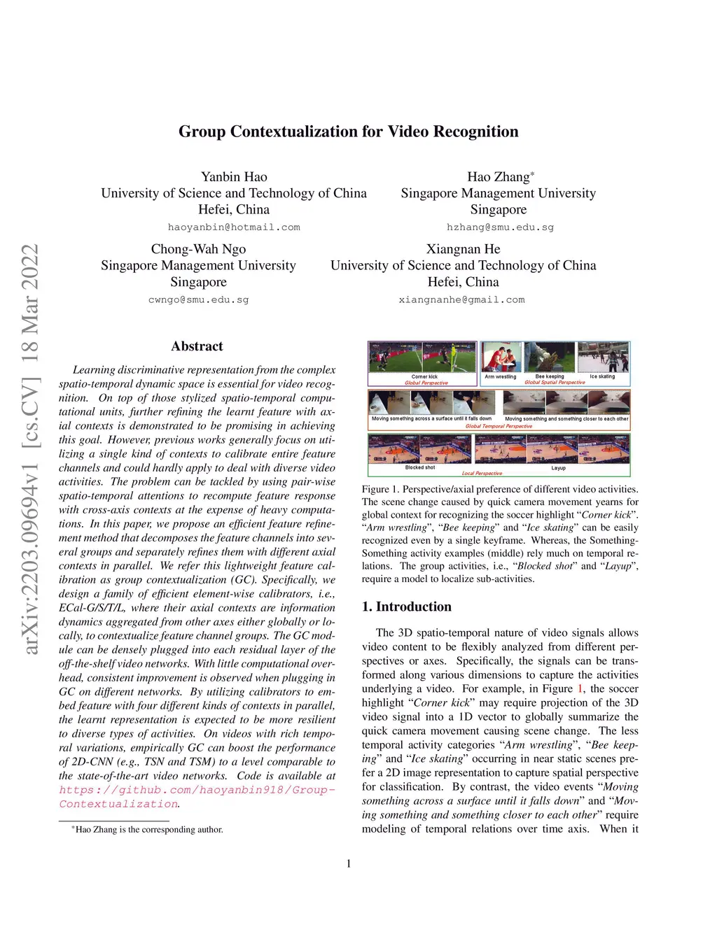 Learning discriminative representation from the complex spatio-temporal dynamic space is essential for video recognition. On top of those stylized spatio-temporal computational units, further refining the learnt feature with axial contexts is demonstrated to be promising in achieving this goal. However, previous works generally focus on utilizing a single kind of contexts to calibrate entire feature channels and could hardly apply to deal with diverse video activities. The problem can be tackled by using pair-wise spatio-temporal attentions to recompute feature response with cross-axis contexts at the expense of heavy computations. In this paper, we propose an efficient feature refinement method that decomposes the feature channels into several groups and separately refines them with different axial contexts in parallel. We refer this lightweight feature calibration as group contextualization (GC). Specifically, we design a family of efficient element-wise calibrators, i.e., ECal-G/S/T/L, where their axial contexts are information dynamics aggregated from other axes either globally or locally, to contextualize feature channel groups. The GC module can be densely plugged into each residual layer of the off-the-shelf video networks. With little computational overhead, consistent improvement is observed when plugging in GC on different networks. By utilizing calibrators to embed feature with four different kinds of contexts in parallel, the learnt representation is expected to be more resilient to diverse types of activities. On videos with rich temporal variations, empirically GC can boost the performance of 2D-CNN (e.g., TSN and TSM) to a level comparable to the state-of-the-art video networks. Code is available at https://github.com/haoyanbin918/Group-Contextualization.