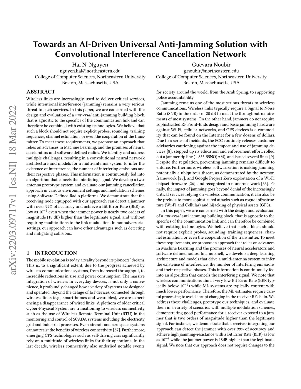 Wireless links are increasingly used to deliver critical services, while intentional interference (jamming) remains a very serious threat to such services. In this paper, we are concerned with the design and evaluation of a universal anti-jamming building block, that is agnostic to the specifics of the communication link and can therefore be combined with existing technologies. We believe that such a block should not require explicit probes, sounding, training sequences, channel estimation, or even the cooperation of the transmitter. To meet these requirements, we propose an approach that relies on advances in Machine Learning, and the promises of neural accelerators and software defined radios. We identify and address multiple challenges, resulting in a convolutional neural network architecture and models for a multi-antenna system to infer the existence of interference, the number of interfering emissions and their respective phases. This information is continuously fed into an algorithm that cancels the interfering signal. We develop a two-antenna prototype system and evaluate our jamming cancellation approach in various environment settings and modulation schemes using Software Defined Radio platforms. We demonstrate that the receiving node equipped with our approach can detect a jammer with over 99% of accuracy and achieve a Bit Error Rate (BER) as low as even when the jammer power is nearly two orders of magnitude (18 dB) higher than the legitimate signal, and without requiring modifications to the link modulation. In non-adversarial settings, our approach can have other advantages such as detecting and mitigating collisions.