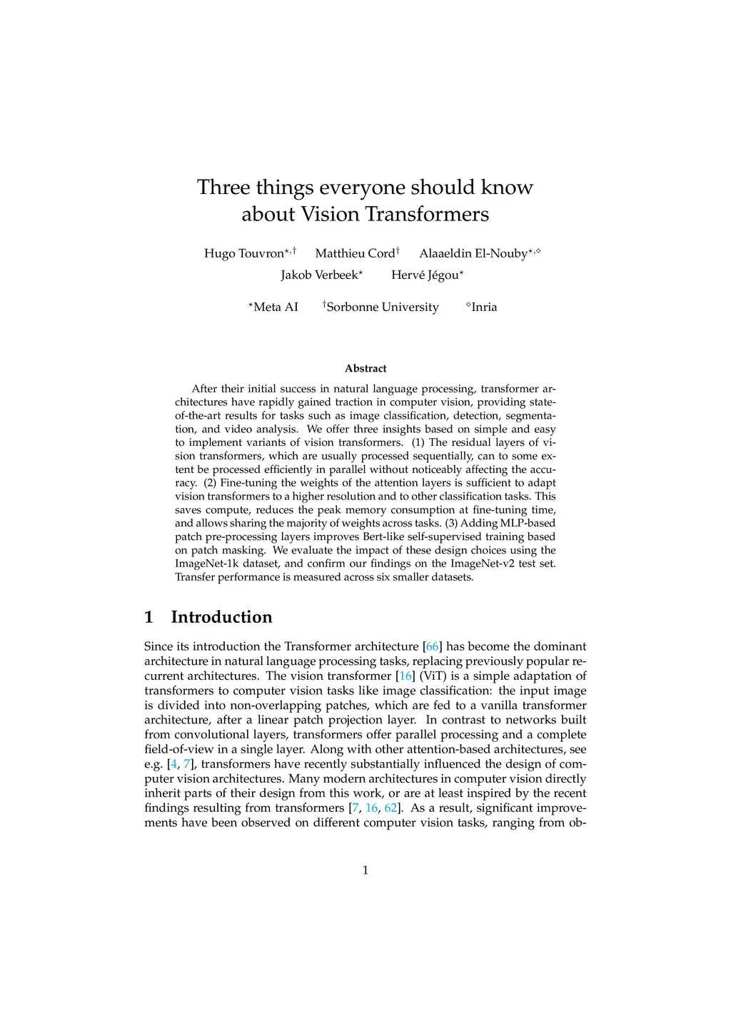 After their initial success in natural language processing, transformer architectures have rapidly gained traction in computer vision, providing state-of-the-art results for tasks such as image classification, detection, segmentation, and video analysis. We offer three insights based on simple and easy to implement variants of vision transformers. (1) The residual layers of vision transformers, which are usually processed sequentially, can to some extent be processed efficiently in parallel without noticeably affecting the accuracy. (2) Fine-tuning the weights of the attention layers is sufficient to adapt vision transformers to a higher resolution and to other classification tasks. This saves compute, reduces the peak memory consumption at fine-tuning time, and allows sharing the majority of weights across tasks. (3) Adding MLP-based patch pre-processing layers improves Bert-like self-supervised training based on patch masking. We evaluate the impact of these design choices using the ImageNet-1k dataset, and confirm our findings on the ImageNet-v2 test set. Transfer performance is measured across six smaller datasets.