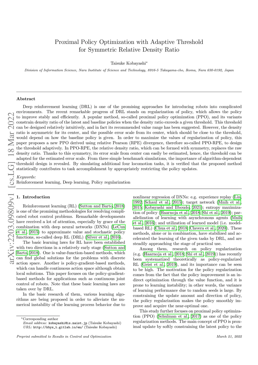 Deep reinforcement learning (DRL) is one of the promising approaches for introducing robots into complicated environments. The recent remarkable progress of DRL stands on regularization of policy, which allows the policy to improve stably and efficiently. A popular method, so-called proximal policy optimization (PPO), and its variants constrain density ratio of the latest and baseline policies when the density ratio exceeds a given threshold. This threshold can be designed relatively intuitively, and in fact its recommended value range has been suggested. However, the density ratio is asymmetric for its center, and the possible error scale from its center, which should be close to the threshold, would depend on how the baseline policy is given. In order to maximize the values of regularization of policy, this paper proposes a new PPO derived using relative Pearson (RPE) divergence, therefore so-called PPO-RPE, to design the threshold adaptively. In PPO-RPE, the relative density ratio, which can be formed with symmetry, replaces the raw density ratio. Thanks to this symmetry, its error scale from center can easily be estimated, hence, the threshold can be adapted for the estimated error scale. From three simple benchmark simulations, the importance of algorithm-dependent threshold design is revealed. By simulating additional four locomotion tasks, it is verified that the proposed method statistically contributes to task accomplishment by appropriately restricting the policy updates.