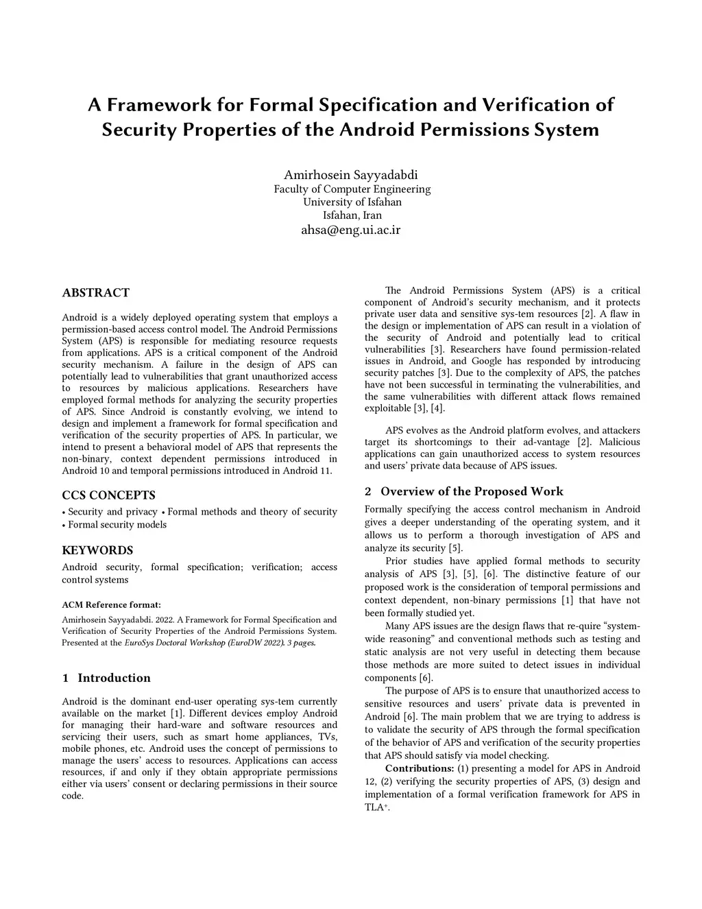 Android is a widely deployed operating system that employs a permission-based access control model. The Android Permissions System (APS) is responsible for mediating resource requests from applications. APS is a critical component of the Android security mechanism. A failure in the design of APS can potentially lead to vulnerabilities that grant unauthorized access to resources by malicious applications. Researchers have employed formal methods for analyzing the security properties of APS. Since Android is constantly evolving, we intend to design and implement a framework for formal specification and verification of the security properties of APS. In particular, we intend to present a behavioral model of APS that represents the non-binary, context dependent permissions introduced in Android 10 and temporal permissions introduced in Android 11.