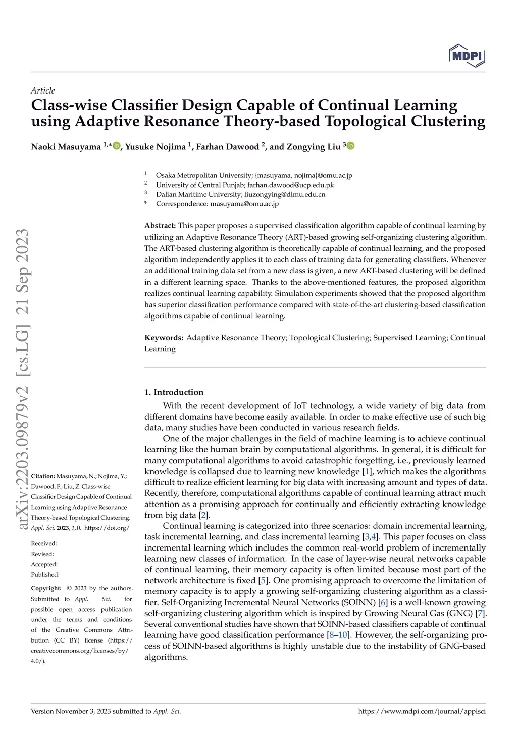 This paper proposes a supervised classification algorithm capable of continual learning by utilizing an Adaptive Resonance Theory (ART)-based growing self-organizing clustering algorithm. The ART-based clustering algorithm is theoretically capable of continual learning, and the proposed algorithm independently applies it to each class of training data for generating classifiers. Whenever an additional training data set from a new class is given, a new ART-based clustering will be defined in a different learning space. Thanks to the above-mentioned features, the proposed algorithm realizes continual learning capability. Simulation experiments showed that the proposed algorithm has superior classification performance compared with state-of-the-art clustering-based classification algorithms capable of continual learning.
