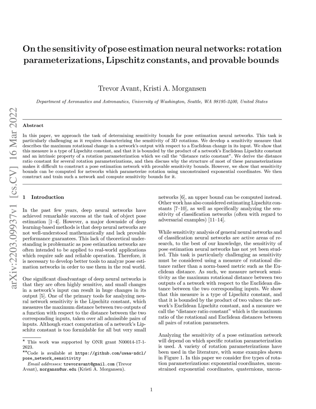 In this paper, we approach the task of determining sensitivity bounds for pose estimation neural networks. This task is particularly challenging as it requires characterizing the sensitivity of 3D rotations. We develop a sensitivity measure that describes the maximum rotational change in a network's output with respect to a Euclidean change in its input. We show that this measure is a type of Lipschitz constant, and that it is bounded by the product of a network's Euclidean Lipschitz constant and an intrinsic property of a rotation parameterization which we call the "distance ratio constant". We derive the distance ratio constant for several rotation parameterizations, and then discuss why the structure of most of these parameterizations makes it difficult to construct a pose estimation network with provable sensitivity bounds. However, we show that sensitivity bounds can be computed for networks which parameterize rotation using unconstrained exponential coordinates. We then construct and train such a network and compute sensitivity bounds for it.