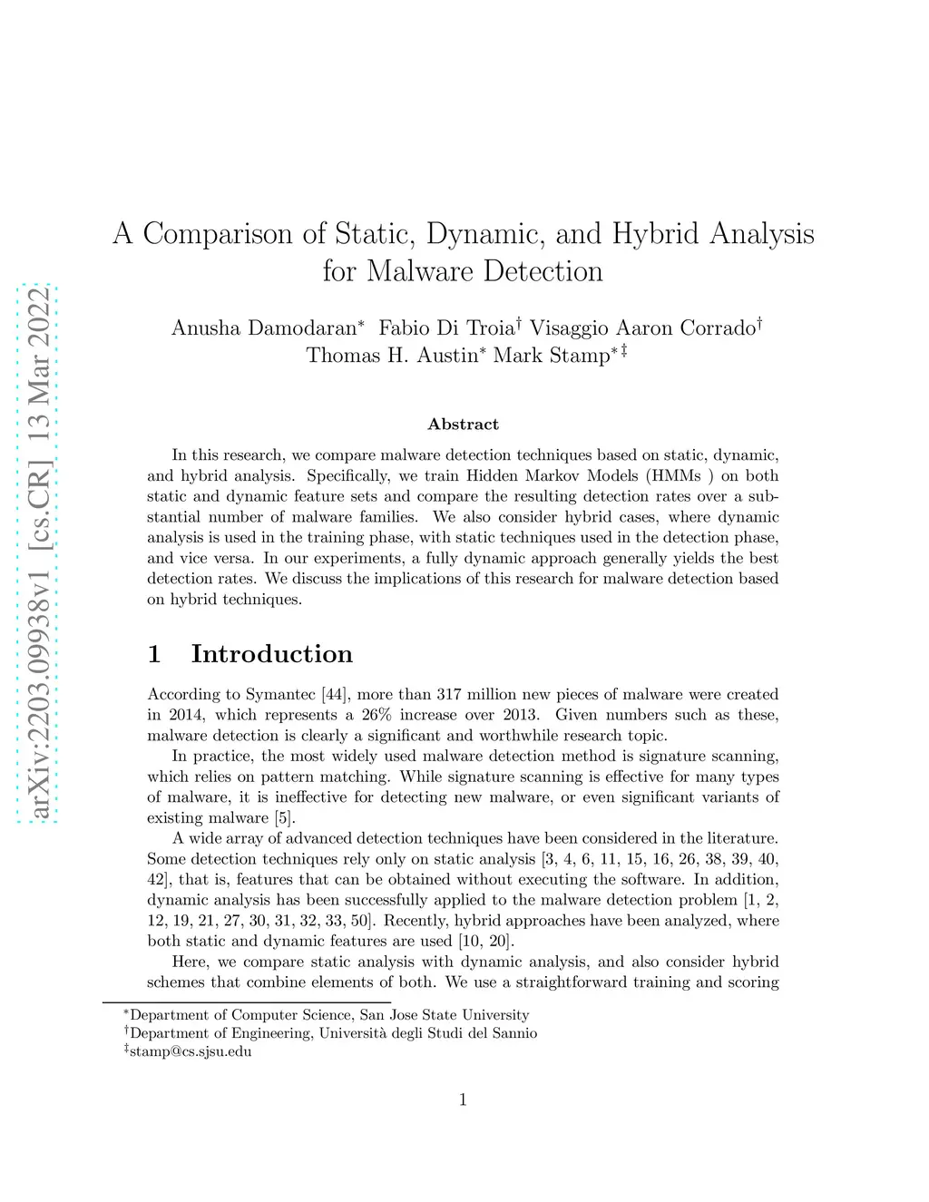 In this research, we compare malware detection techniques based on static, dynamic, and hybrid analysis. Specifically, we train Hidden Markov Models (HMMs ) on both static and dynamic feature sets and compare the resulting detection rates over a substantial number of malware families. We also consider hybrid cases, where dynamic analysis is used in the training phase, with static techniques used in the detection phase, and vice versa. In our experiments, a fully dynamic approach generally yields the best detection rates. We discuss the implications of this research for malware detection based on hybrid techniques.