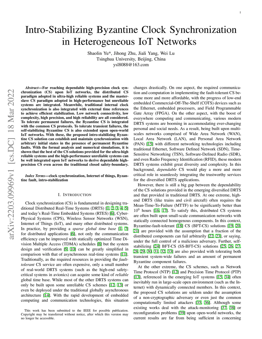 For reaching dependable high-precision clock synchronization (CS) upon IoT networks, the distributed CS paradigm adopted in ultra-high reliable systems and the master-slave CS paradigm adopted in high-performance but unreliable systems are integrated. Meanwhile, traditional internal clock synchronization is also integrated with external time references to achieve efficient stabilization. Low network connectivity, low complexity, high precision, and high reliability are all considered. To tolerate permanent failures, the Byzantine CS is integrated with the common CS protocols. To tolerate transient failures, the self-stabilizing Byzantine CS is also extended upon open-world IoT networks. With these, the proposed intro-stabilizing Byzantine CS solution can establish and maintain synchronization with arbitrary initial states in the presence of permanent Byzantine faults. With the formal analysis and numerical simulations, it is shown that the best of the CS solutions provided for the ultra-high reliable systems and the high-performance unreliable systems can be well integrated upon IoT networks to derive dependable high-precision CS even across the traditional closed safety-boundary.