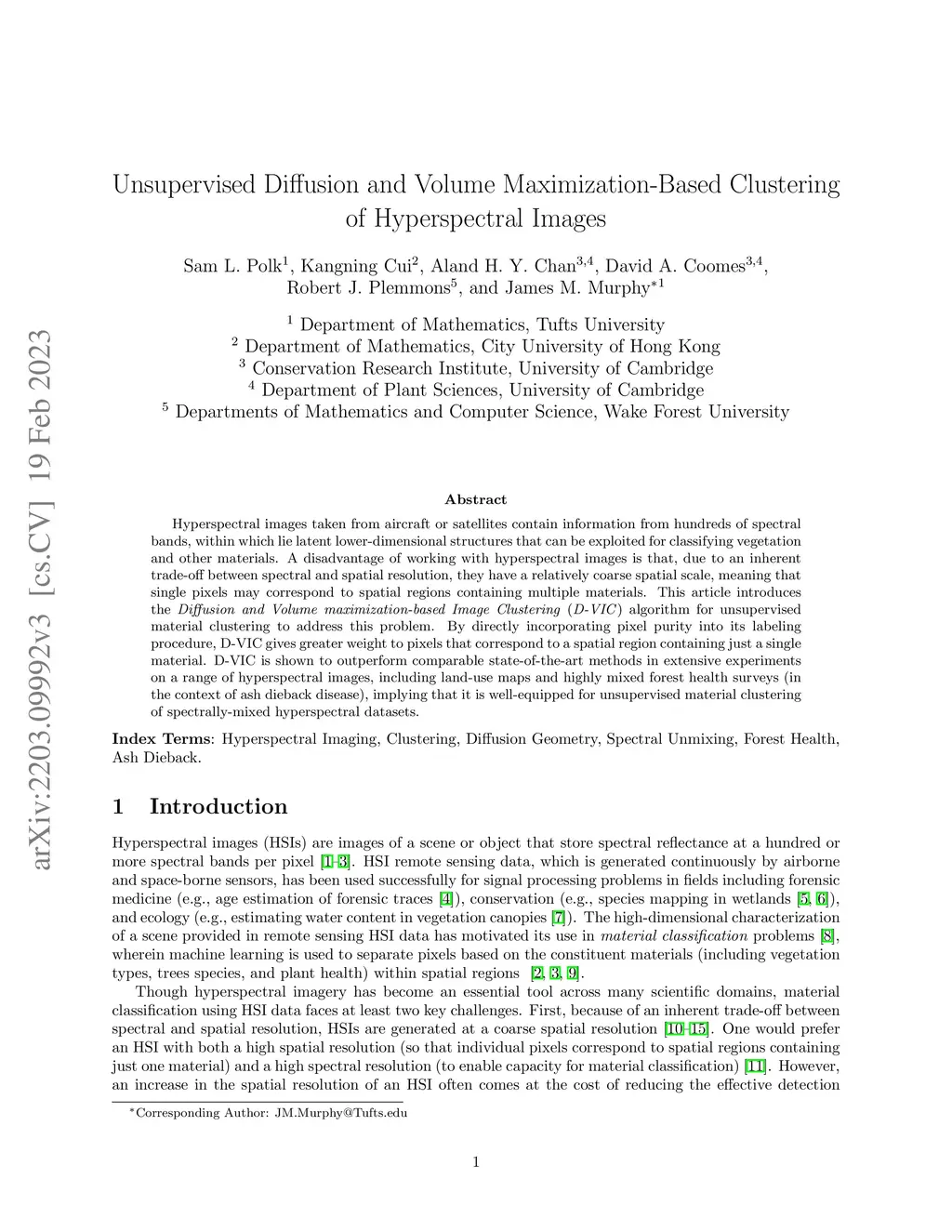 Hyperspectral images taken from aircraft or satellites contain information from hundreds of spectral bands, within which lie latent lower-dimensional structures that can be exploited for classifying vegetation and other materials. A disadvantage of working with hyperspectral images is that, due to an inherent trade-off between spectral and spatial resolution, they have a relatively coarse spatial scale, meaning that single pixels may correspond to spatial regions containing multiple materials. This article introduces the Diffusion and Volume maximization-based Image Clustering (D-VIC) algorithm for unsupervised material clustering to address this problem. By directly incorporating pixel purity into its labeling procedure, D-VIC gives greater weight to pixels that correspond to a spatial region containing just a single material. D-VIC is shown to outperform comparable state-of-the-art methods in extensive experiments on a range of hyperspectral images, including land-use maps and highly mixed forest health surveys (in the context of ash dieback disease), implying that it is well-equipped for unsupervised material clustering of spectrally-mixed hyperspectral datasets.