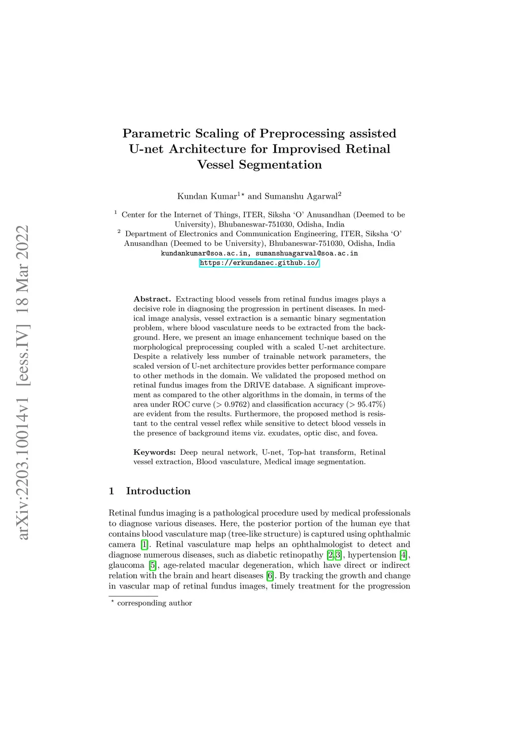 Extracting blood vessels from retinal fundus images plays a decisive role in diagnosing the progression in pertinent diseases. In medical image analysis, vessel extraction is a semantic binary segmentation problem, where blood vasculature needs to be extracted from the background. Here, we present an image enhancement technique based on the morphological preprocessing coupled with a scaled U-net architecture. Despite a relatively less number of trainable network parameters, the scaled version of U-net architecture provides better performance compare to other methods in the domain. We validated the proposed method on retinal fundus images from the DRIVE database. A significant improvement as compared to the other algorithms in the domain, in terms of the area under ROC curve (>0.9762) and classification accuracy (>95.47%) are evident from the results. Furthermore, the proposed method is resistant to the central vessel reflex while sensitive to detect blood vessels in the presence of background items viz. exudates, optic disc, and fovea.