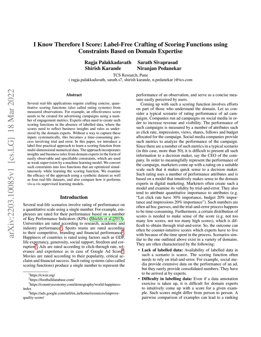 I Know Therefore I Score: Label-Free Crafting of Scoring Functions using Constraints Based on Domain Expertise