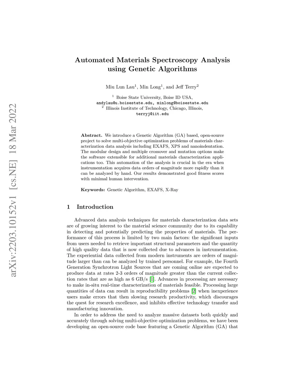 We introduce a Genetic Algorithm (GA) based, open-source project to solve multi-objective optimization problems of materials characterization data analysis including EXAFS, XPS and nanoindentation. The modular design and multiple crossover and mutation options make the software extensible for additional materials characterization applications too. This automation of the analysis is crucial in the era when instrumentation acquires data orders of magnitude more rapidly than it can be analyzed by hand. Our results demonstrated good fitness scores with minimal human intervention.