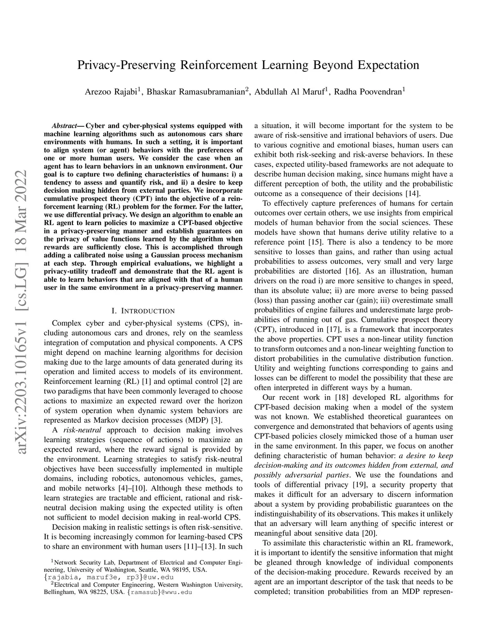Cyber and cyber-physical systems equipped with machine learning algorithms such as autonomous cars share environments with humans. In such a setting, it is important to align system (or agent) behaviors with the preferences of one or more human users. We consider the case when an agent has to learn behaviors in an unknown environment. Our goal is to capture two defining characteristics of humans: i) a tendency to assess and quantify risk, and ii) a desire to keep decision making hidden from external parties. We incorporate cumulative prospect theory (CPT) into the objective of a reinforcement learning (RL) problem for the former. For the latter, we use differential privacy. We design an algorithm to enable an RL agent to learn policies to maximize a CPT-based objective in a privacy-preserving manner and establish guarantees on the privacy of value functions learned by the algorithm when rewards are sufficiently close. This is accomplished through adding a calibrated noise using a Gaussian process mechanism at each step. Through empirical evaluations, we highlight a privacy-utility tradeoff and demonstrate that the RL agent is able to learn behaviors that are aligned with that of a human user in the same environment in a privacy-preserving manner