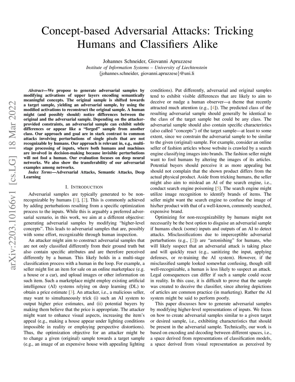 We propose to generate adversarial samples by modifying activations of upper layers encoding semantically meaningful concepts. The original sample is shifted towards a target sample, yielding an adversarial sample, by using the modified activations to reconstruct the original sample. A human might (and possibly should) notice differences between the original and the adversarial sample. Depending on the attacker-provided constraints, an adversarial sample can exhibit subtle differences or appear like a "forged" sample from another class. Our approach and goal are in stark contrast to common attacks involving perturbations of single pixels that are not recognizable by humans. Our approach is relevant in, e.g., multi-stage processing of inputs, where both humans and machines are involved in decision-making because invisible perturbations will not fool a human. Our evaluation focuses on deep neural networks. We also show the transferability of our adversarial examples among networks.