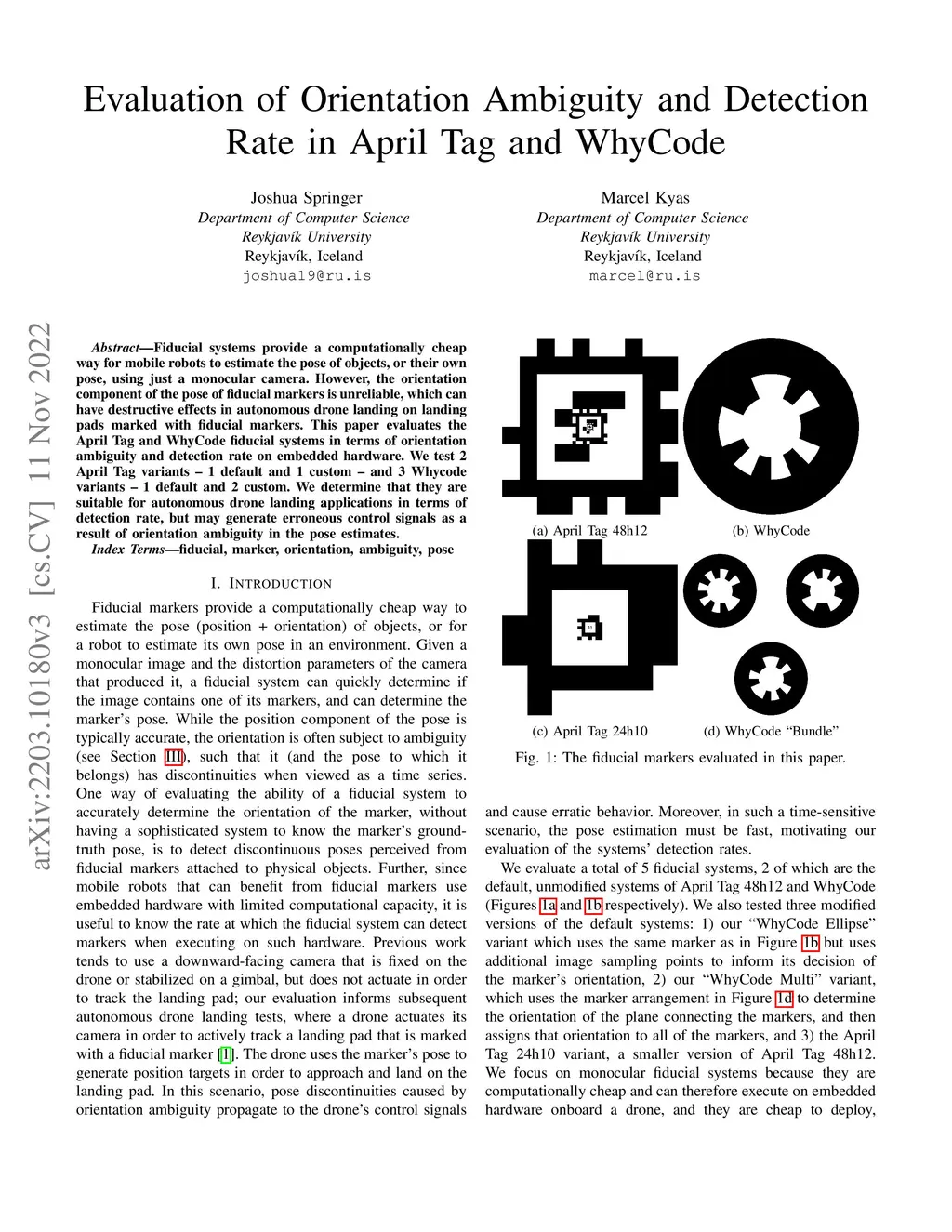 Fiducial systems provide a computationally cheap way for mobile robots to estimate the pose of objects, or their own pose, using just a monocular camera. However, the orientation component of the pose of fiducial markers is unreliable, which can have destructive effects in autonomous drone landing on landing pads marked with fiducial markers. This paper evaluates the April Tag and WhyCode fiducial systems in terms of orientation ambiguity and detection rate on embedded hardware. We test 2 April Tag variants - 1 default and 1 custom - and 3 Whycode variants - 1 default and 2 custom. We determine that they are suitable for autonomous drone landing applications in terms of detection rate, but may generate erroneous control signals as a result of orientation ambiguity in the pose estimates.
