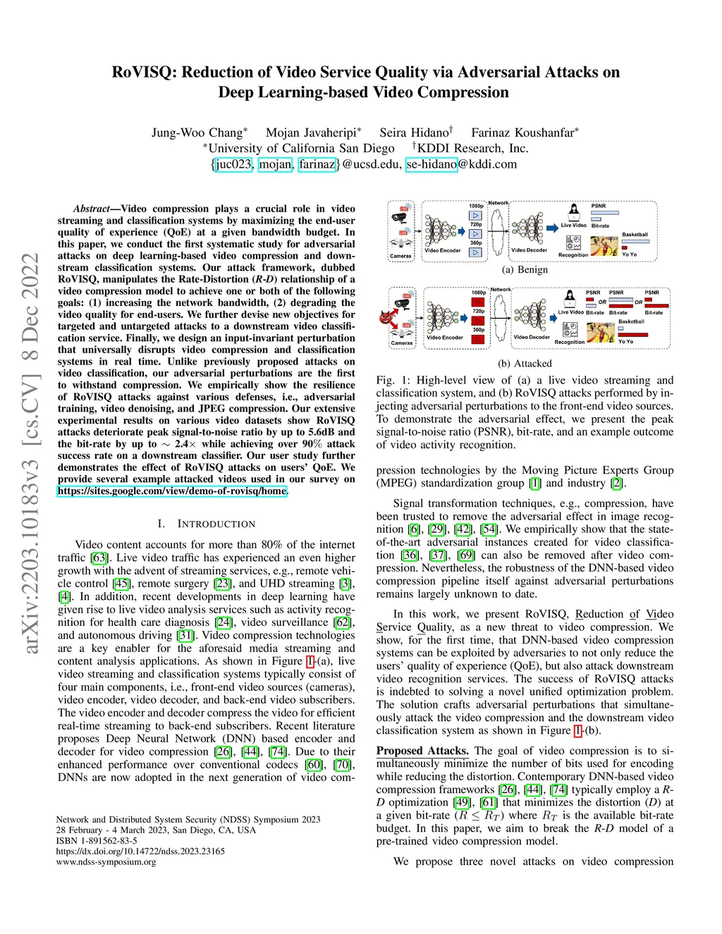 Video compression plays a crucial role in video streaming and classification systems by maximizing the end-user quality of experience (QoE) at a given bandwidth budget. In this paper, we conduct the first systematic study for adversarial attacks on deep learning-based video compression and downstream classification systems. Our attack framework, dubbed RoVISQ, manipulates the Rate-Distortion (-) relationship of a video compression model to achieve one or both of the following goals: (1) increasing the network bandwidth, (2) degrading the video quality for end-users. We further devise new objectives for targeted and untargeted attacks to a downstream video classification service. Finally, we design an input-invariant perturbation that universally disrupts video compression and classification systems in real time. Unlike previously proposed attacks on video classification, our adversarial perturbations are the first to withstand compression. We empirically show the resilience of RoVISQ attacks against various defenses, i.e., adversarial training, video denoising, and JPEG compression. Our extensive experimental results on various video datasets show RoVISQ attacks deteriorate peak signal-to-noise ratio by up to 5.6dB and the bit-rate by up to 2.4 while achieving over 90 attack success rate on a downstream classifier. Our user study further demonstrates the effect of RoVISQ attacks on users' QoE.