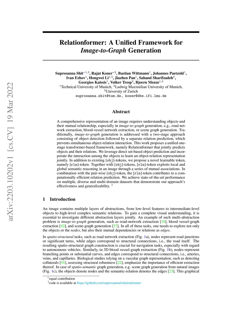 A comprehensive representation of an image requires understanding objects and their mutual relationship, especially in image-to-graph generation, e.g., road network extraction, blood-vessel network extraction, or scene graph generation. Traditionally, image-to-graph generation is addressed with a two-stage approach consisting of object detection followed by a separate relation prediction, which prevents simultaneous object-relation interaction. This work proposes a unified one-stage transformer-based framework, namely Relationformer, that jointly predicts objects and their relations. We leverage direct set-based object prediction and incorporate the interaction among the objects to learn an object-relation representation jointly. In addition to existing [obj]-tokens, we propose a novel learnable token, namely [rln]-token. Together with [obj]-tokens, [rln]-token exploits local and global semantic reasoning in an image through a series of mutual associations. In combination with the pair-wise [obj]-token, the [rln]-token contributes to a computationally efficient relation prediction. We achieve state-of-the-art performance on multiple, diverse and multi-domain datasets that demonstrate our approach's effectiveness and generalizability.