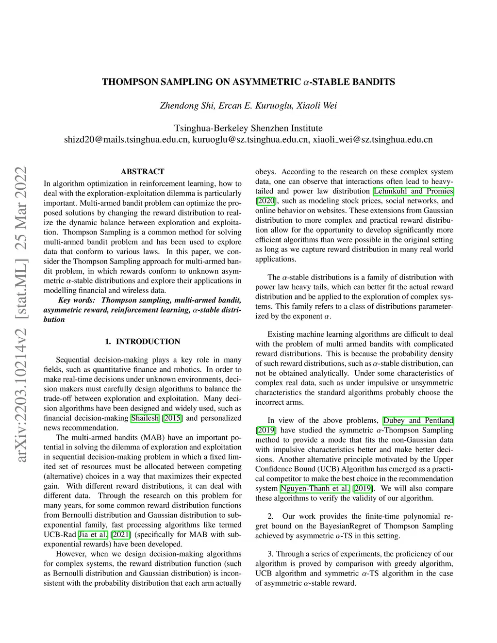 In algorithm optimization in reinforcement learning, how to deal with the exploration-exploitation dilemma is particularly important. Multi-armed bandit problem can optimize the proposed solutions by changing the reward distribution to realize the dynamic balance between exploration and exploitation. Thompson Sampling is a common method for solving multi-armed bandit problem and has been used to explore data that conform to various laws. In this paper, we consider the Thompson Sampling approach for multi-armed bandit problem, in which rewards conform to unknown asymmetric -stable distributions and explore their applications in modelling financial and wireless data.