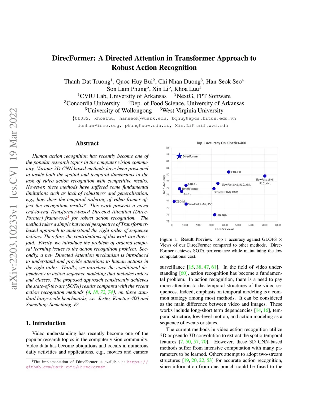 Human action recognition has recently become one of the popular research topics in the computer vision community. Various 3D-CNN based methods have been presented to tackle both the spatial and temporal dimensions in the task of video action recognition with competitive results. However, these methods have suffered some fundamental limitations such as lack of robustness and generalization, e.g., how does the temporal ordering of video frames affect the recognition results? This work presents a novel end-to-end Transformer-based Directed Attention (DirecFormer) framework for robust action recognition. The method takes a simple but novel perspective of Transformer-based approach to understand the right order of sequence actions. Therefore, the contributions of this work are three-fold. Firstly, we introduce the problem of ordered temporal learning issues to the action recognition problem. Secondly, a new Directed Attention mechanism is introduced to understand and provide attentions to human actions in the right order. Thirdly, we introduce the conditional dependency in action sequence modeling that includes orders and classes. The proposed approach consistently achieves the state-of-the-art (SOTA) results compared with the recent action recognition methods, on three standard large-scale benchmarks, i.e. Jester, Kinetics-400 and Something-Something-V2.