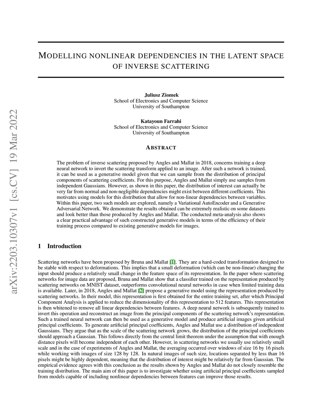 The problem of inverse scattering proposed by Angles and Mallat in 2018, concerns training a deep neural network to invert the scattering transform applied to an image. After such a network is trained, it can be used as a generative model given that we can sample from the distribution of principal components of scattering coefficients. For this purpose, Angles and Mallat simply use samples from independent Gaussians. However, as shown in this paper, the distribution of interest can actually be very far from normal and non-negligible dependencies might exist between different coefficients. This motivates using models for this distribution that allow for non-linear dependencies between variables. Within this paper, two such models are explored, namely a Variational AutoEncoder and a Generative Adversarial Network. We demonstrate the results obtained can be extremely realistic on some datasets and look better than those produced by Angles and Mallat. The conducted meta-analysis also shows a clear practical advantage of such constructed generative models in terms of the efficiency of their training process compared to existing generative models for images.