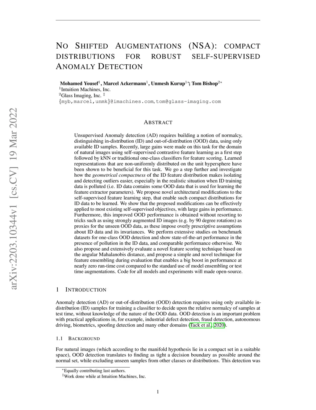 Unsupervised Anomaly detection (AD) requires building a notion of normalcy, distinguishing in-distribution (ID) and out-of-distribution (OOD) data, using only available ID samples. Recently, large gains were made on this task for the domain of natural images using self-supervised contrastive feature learning as a first step followed by kNN or traditional one-class classifiers for feature scoring. Learned representations that are non-uniformly distributed on the unit hypersphere have been shown to be beneficial for this task. We go a step further and investigate how the \emph {geometrical compactness} of the ID feature distribution makes isolating and detecting outliers easier, especially in the realistic situation when ID training data is polluted (i.e. ID data contains some OOD data that is used for learning the feature extractor parameters). We propose novel architectural modifications to the self-supervised feature learning step, that enable such compact distributions for ID data to be learned. We show that the proposed modifications can be effectively applied to most existing self-supervised objectives, with large gains in performance. Furthermore, this improved OOD performance is obtained without resorting to tricks such as using strongly augmented ID images (e.g. by 90 degree rotations) as proxies for the unseen OOD data, as these impose overly prescriptive assumptions about ID data and its invariances. We perform extensive studies on benchmark datasets for one-class OOD detection and show state-of-the-art performance in the presence of pollution in the ID data, and comparable performance otherwise. We also propose and extensively evaluate a novel feature scoring technique based on the angular Mahalanobis distance, and propose a simple and novel technique for feature ensembling during evaluation that enables a big boost in performance at nearly zero run-time cost.
