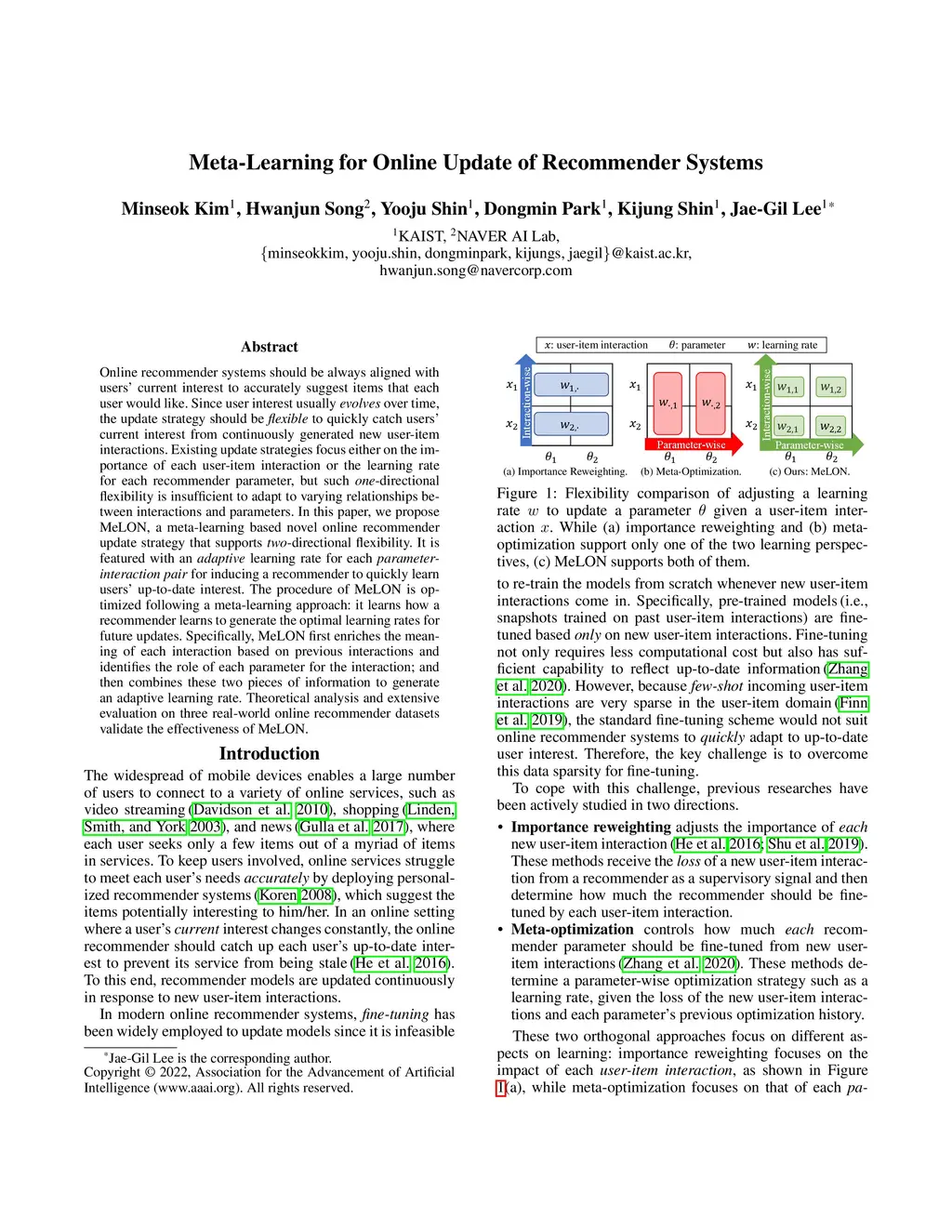 Online recommender systems should be always aligned with users' current interest to accurately suggest items that each user would like. Since user interest usually evolves over time, the update strategy should be flexible to quickly catch users' current interest from continuously generated new user-item interactions. Existing update strategies focus either on the importance of each user-item interaction or the learning rate for each recommender parameter, but such one-directional flexibility is insufficient to adapt to varying relationships between interactions and parameters. In this paper, we propose MeLON, a meta-learning based novel online recommender update strategy that supports two-directional flexibility. It is featured with an adaptive learning rate for each parameter-interaction pair for inducing a recommender to quickly learn users' up-to-date interest. The procedure of MeLON is optimized following a meta-learning approach: it learns how a recommender learns to generate the optimal learning rates for future updates. Specifically, MeLON first enriches the meaning of each interaction based on previous interactions and identifies the role of each parameter for the interaction; and then combines these two pieces of information to generate an adaptive learning rate. Theoretical analysis and extensive evaluation on three real-world online recommender datasets validate the effectiveness of MeLON.