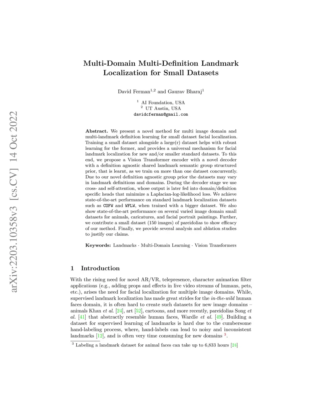 We present a novel method for multi image domain and multi-landmark definition learning for small dataset facial localization. Training a small dataset alongside a large(r) dataset helps with robust learning for the former, and provides a universal mechanism for facial landmark localization for new and/or smaller standard datasets. To this end, we propose a Vision Transformer encoder with a novel decoder with a definition agnostic shared landmark semantic group structured prior, that is learnt, as we train on more than one dataset concurrently. Due to our novel definition agnostic group prior the datasets may vary in landmark definitions and domains. During the decoder stage we use cross- and self-attention, whose output is later fed into domain/definition specific heads that minimize a Laplacian-log-likelihood loss. We achieve state-of-the-art performance on standard landmark localization datasets such as COFW and WFLW, when trained with a bigger dataset. We also show state-of-the-art performance on several varied image domain small datasets for animals, caricatures, and facial portrait paintings. Further, we contribute a small dataset (150 images) of pareidolias to show efficacy of our method. Finally, we provide several analysis and ablation studies to justify our claims.
