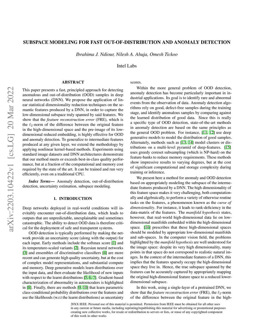This paper presents a fast, principled approach for detecting anomalous and out-of-distribution (OOD) samples in deep neural networks (DNN). We propose the application of linear statistical dimensionality reduction techniques on the semantic features produced by a DNN, in order to capture the low-dimensional subspace truly spanned by said features. We show that the "feature reconstruction error" (FRE), which is the -norm of the difference between the original feature in the high-dimensional space and the pre-image of its low-dimensional reduced embedding, is highly effective for OOD and anomaly detection. To generalize to intermediate features produced at any given layer, we extend the methodology by applying nonlinear kernel-based methods. Experiments using standard image datasets and DNN architectures demonstrate that our method meets or exceeds best-in-class quality performance, but at a fraction of the computational and memory cost required by the state of the art. It can be trained and run very efficiently, even on a traditional CPU.