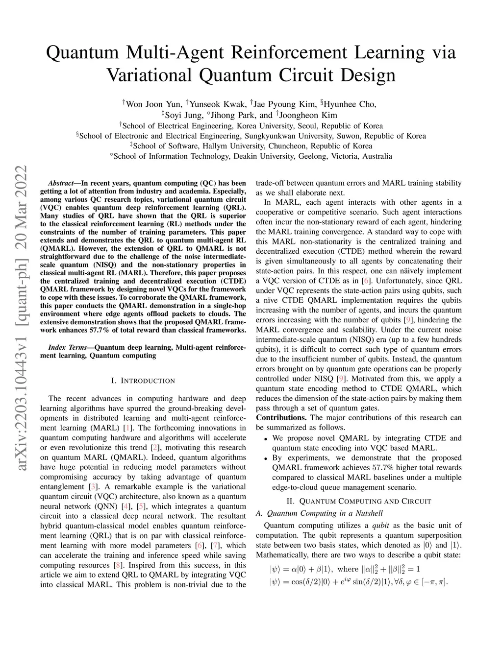In recent years, quantum computing (QC) has been getting a lot of attention from industry and academia. Especially, among various QC research topics, variational quantum circuit (VQC) enables quantum deep reinforcement learning (QRL). Many studies of QRL have shown that the QRL is superior to the classical reinforcement learning (RL) methods under the constraints of the number of training parameters. This paper extends and demonstrates the QRL to quantum multi-agent RL (QMARL). However, the extension of QRL to QMARL is not straightforward due to the challenge of the noise intermediate-scale quantum (NISQ) and the non-stationary properties in classical multi-agent RL (MARL). Therefore, this paper proposes the centralized training and decentralized execution (CTDE) QMARL framework by designing novel VQCs for the framework to cope with these issues. To corroborate the QMARL framework, this paper conducts the QMARL demonstration in a single-hop environment where edge agents offload packets to clouds. The extensive demonstration shows that the proposed QMARL framework enhances 57.7% of total reward than classical frameworks.