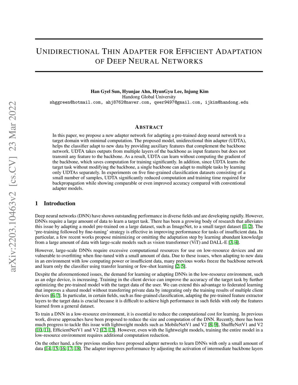 In this paper, we propose a new adapter network for adapting a pre-trained deep neural network to a target domain with minimal computation. The proposed model, unidirectional thin adapter (UDTA), helps the classifier adapt to new data by providing auxiliary features that complement the backbone network. UDTA takes outputs from multiple layers of the backbone as input features but does not transmit any feature to the backbone. As a result, UDTA can learn without computing the gradient of the backbone, which saves computation for training significantly. In addition, since UDTA learns the target task without modifying the backbone, a single backbone can adapt to multiple tasks by learning only UDTAs separately. In experiments on five fine-grained classification datasets consisting of a small number of samples, UDTA significantly reduced computation and training time required for backpropagation while showing comparable or even improved accuracy compared with conventional adapter models.