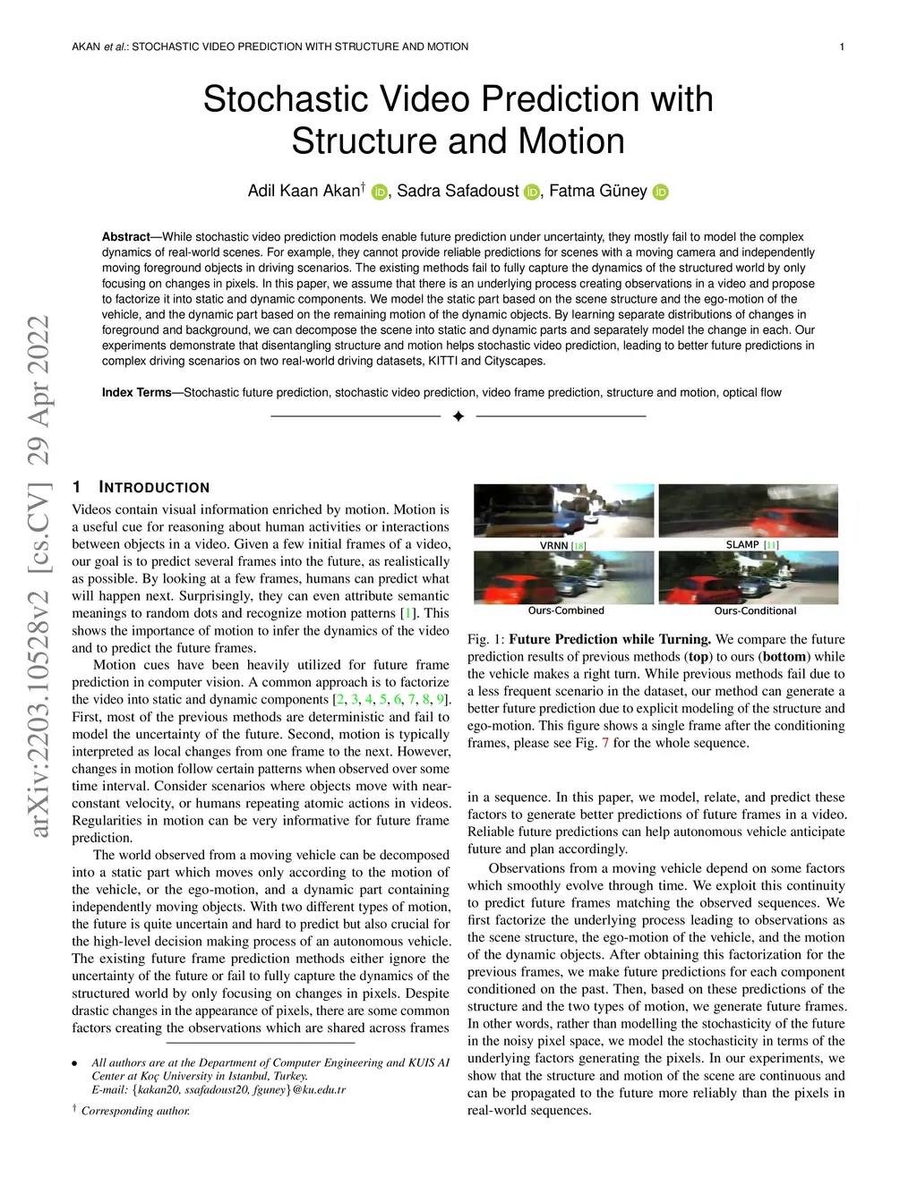 While stochastic video prediction models enable future prediction under uncertainty, they mostly fail to model the complex dynamics of real-world scenes. For example, they cannot provide reliable predictions for scenes with a moving camera and independently moving foreground objects in driving scenarios. The existing methods fail to fully capture the dynamics of the structured world by only focusing on changes in pixels. In this paper, we assume that there is an underlying process creating observations in a video and propose to factorize it into static and dynamic components. We model the static part based on the scene structure and the ego-motion of the vehicle, and the dynamic part based on the remaining motion of the dynamic objects. By learning separate distributions of changes in foreground and background, we can decompose the scene into static and dynamic parts and separately model the change in each. Our experiments demonstrate that disentangling structure and motion helps stochastic video prediction, leading to better future predictions in complex driving scenarios on two real-world driving datasets, KITTI and Cityscapes.