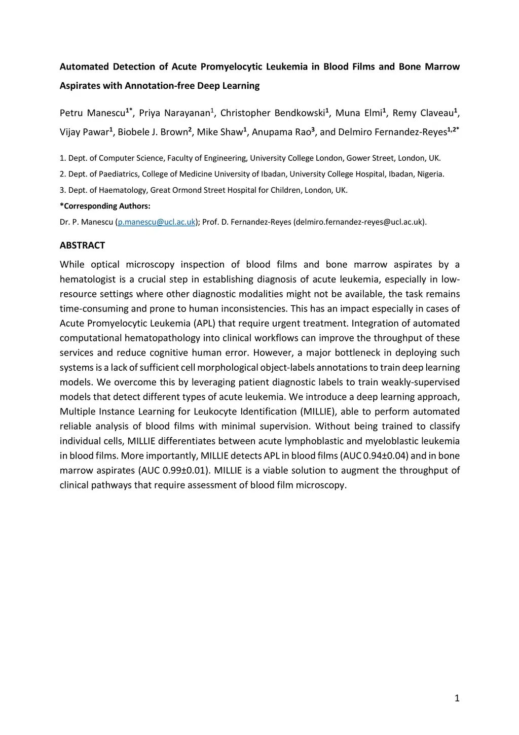 While optical microscopy inspection of blood films and bone marrow aspirates by a hematologist is a crucial step in establishing diagnosis of acute leukemia, especially in low-resource settings where other diagnostic modalities might not be available, the task remains time-consuming and prone to human inconsistencies. This has an impact especially in cases of Acute Promyelocytic Leukemia (APL) that require urgent treatment. Integration of automated computational hematopathology into clinical workflows can improve the throughput of these services and reduce cognitive human error. However, a major bottleneck in deploying such systems is a lack of sufficient cell morphological object-labels annotations to train deep learning models. We overcome this by leveraging patient diagnostic labels to train weakly-supervised models that detect different types of acute leukemia. We introduce a deep learning approach, Multiple Instance Learning for Leukocyte Identification (MILLIE), able to perform automated reliable analysis of blood films with minimal supervision. Without being trained to classify individual cells, MILLIE differentiates between acute lymphoblastic and myeloblastic leukemia in blood films. More importantly, MILLIE detects APL in blood films (AUC 0.94+/-0.04) and in bone marrow aspirates (AUC 0.99+/-0.01). MILLIE is a viable solution to augment the throughput of clinical pathways that require assessment of blood film microscopy.