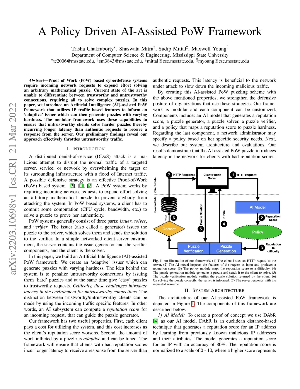 Proof of Work (PoW) based cyberdefense systems require incoming network requests to expend effort solving an arbitrary mathematical puzzle. Current state of the art is unable to differentiate between trustworthy and untrustworthy connections, requiring all to solve complex puzzles. In this paper, we introduce an Artificial Intelligence (AI)-assisted PoW framework that utilizes IP traffic based features to inform an adaptive issuer which can then generate puzzles with varying hardness. The modular framework uses these capabilities to ensure that untrustworthy clients solve harder puzzles thereby incurring longer latency than authentic requests to receive a response from the server. Our preliminary findings reveal our approach effectively throttles untrustworthy traffic.