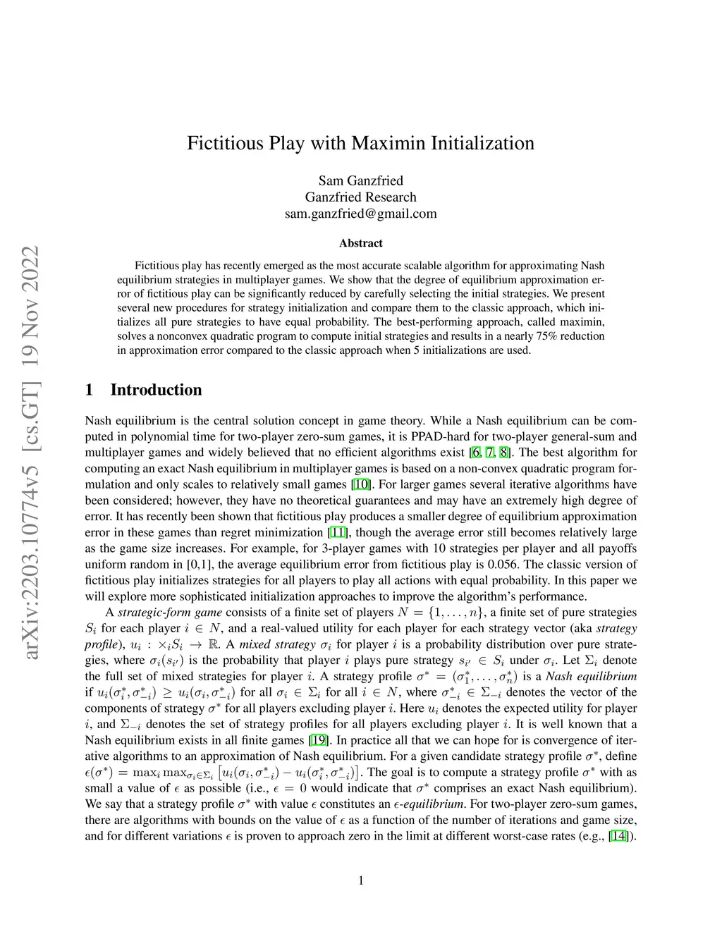 Fictitious play has recently emerged as the most accurate scalable algorithm for approximating Nash equilibrium strategies in multiplayer games. We show that the degree of equilibrium approximation error of fictitious play can be significantly reduced by carefully selecting the initial strategies. We present several new procedures for strategy initialization and compare them to the classic approach, which initializes all pure strategies to have equal probability. The best-performing approach, called maximin, solves a nonconvex quadratic program to compute initial strategies and results in a nearly 75% reduction in approximation error compared to the classic approach when 5 initializations are used.