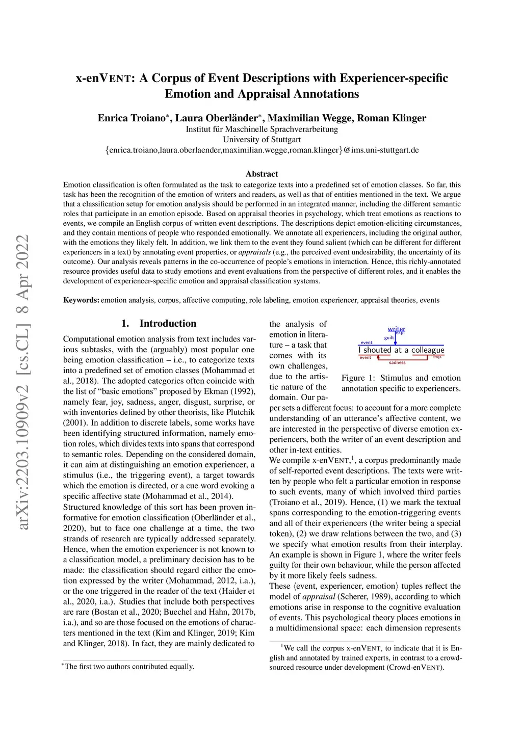 Emotion classification is often formulated as the task to categorize texts into a predefined set of emotion classes. So far, this task has been the recognition of the emotion of writers and readers, as well as that of entities mentioned in the text. We argue that a classification setup for emotion analysis should be performed in an integrated manner, including the different semantic roles that participate in an emotion episode. Based on appraisal theories in psychology, which treat emotions as reactions to events, we compile an English corpus of written event descriptions. The descriptions depict emotion-eliciting circumstances, and they contain mentions of people who responded emotionally. We annotate all experiencers, including the original author, with the emotions they likely felt. In addition, we link them to the event they found salient (which can be different for different experiencers in a text) by annotating event properties, or appraisals (e.g., the perceived event undesirability, the uncertainty of its outcome). Our analysis reveals patterns in the co-occurrence of people's emotions in interaction. Hence, this richly-annotated resource provides useful data to study emotions and event evaluations from the perspective of different roles, and it enables the development of experiencer-specific emotion and appraisal classification systems.