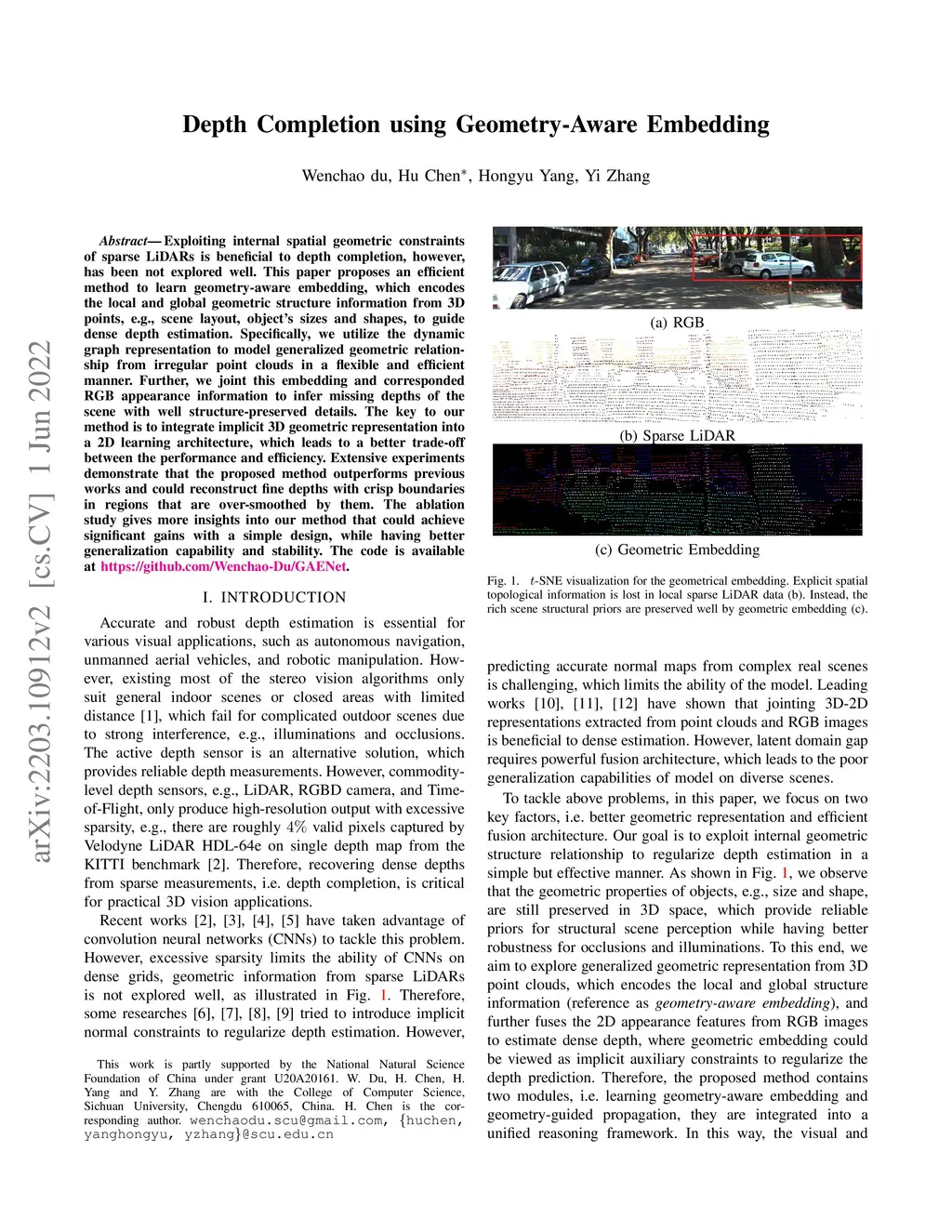 Exploiting internal spatial geometric constraints of sparse LiDARs is beneficial to depth completion, however, has been not explored well. This paper proposes an efficient method to learn geometry-aware embedding, which encodes the local and global geometric structure information from 3D points, e.g., scene layout, object's sizes and shapes, to guide dense depth estimation. Specifically, we utilize the dynamic graph representation to model generalized geometric relationship from irregular point clouds in a flexible and efficient manner. Further, we joint this embedding and corresponded RGB appearance information to infer missing depths of the scene with well structure-preserved details. The key to our method is to integrate implicit 3D geometric representation into a 2D learning architecture, which leads to a better trade-off between the performance and efficiency. Extensive experiments demonstrate that the proposed method outperforms previous works and could reconstruct fine depths with crisp boundaries in regions that are over-smoothed by them. The ablation study gives more insights into our method that could achieve significant gains with a simple design, while having better generalization capability and stability. The code is available at https://github.com/Wenchao-Du/GAENet.