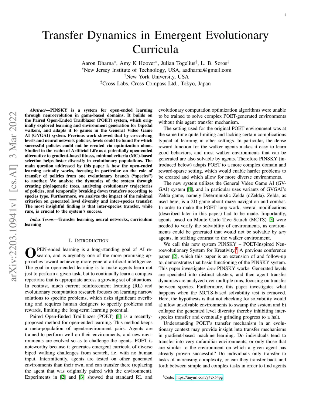 PINSKY is a system for open-ended learning through neuroevolution in game-based domains. It builds on the Paired Open-Ended Trailblazer (POET) system, which originally explored learning and environment generation for bipedal walkers, and adapts it to games in the General Video Game AI (GVGAI) system. Previous work showed that by co-evolving levels and neural network policies, levels could be found for which successful policies could not be created via optimization alone. Studied in the realm of Artificial Life as a potentially open-ended alternative to gradient-based fitness, minimal criteria (MC)-based selection helps foster diversity in evolutionary populations. The main question addressed by this paper is how the open-ended learning actually works, focusing in particular on the role of transfer of policies from one evolutionary branch ("species") to another. We analyze the dynamics of the system through creating phylogenetic trees, analyzing evolutionary trajectories of policies, and temporally breaking down transfers according to species type. Furthermore, we analyze the impact of the minimal criterion on generated level diversity and inter-species transfer. The most insightful finding is that inter-species transfer, while rare, is crucial to the system's success.