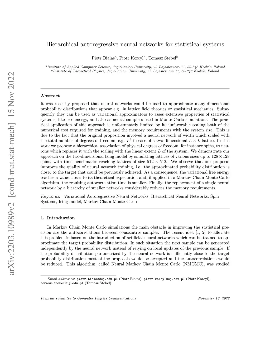 It was recently proposed that neural networks could be used to approximate many-dimensional probability distributions that appear e.g. in lattice field theories or statistical mechanics. Subsequently they can be used as variational approximators to asses extensive properties of statistical systems, like free energy, and also as neural samplers used in Monte Carlo simulations. The practical application of this approach is unfortunately limited by its unfavorable scaling both of the numerical cost required for training, and the memory requirements with the system size. This is due to the fact that the original proposition involved a neural network of width which scaled with the total number of degrees of freedom, e.g. in case of a two dimensional lattice. In this work we propose a hierarchical association of physical degrees of freedom, for instance spins, to neurons which replaces it with the scaling with the linear extent of the system. We demonstrate our approach on the two-dimensional Ising model by simulating lattices of various sizes up to spins, with time benchmarks reaching lattices of size . We observe that our proposal improves the quality of neural network training, i.e. the approximated probability distribution is closer to the target that could be previously achieved. As a consequence, the variational free energy reaches a value closer to its theoretical expectation and, if applied in a Markov Chain Monte Carlo algorithm, the resulting autocorrelation time is smaller. Finally, the replacement of a single neural network by a hierarchy of smaller networks considerably reduces the memory requirements.
