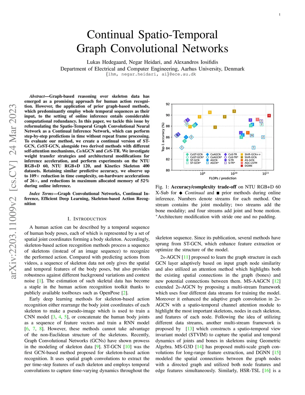Graph-based reasoning over skeleton data has emerged as a promising approach for human action recognition. However, the application of prior graph-based methods, which predominantly employ whole temporal sequences as their input, to the setting of online inference entails considerable computational redundancy. In this paper, we tackle this issue by reformulating the Spatio-Temporal Graph Convolutional Neural Network as a Continual Inference Network, which can perform step-by-step predictions in time without repeat frame processing. To evaluate our method, we create a continual version of ST-GCN, CoST-GCN, alongside two derived methods with different self-attention mechanisms, CoAGCN and CoS-TR. We investigate weight transfer strategies and architectural modifications for inference acceleration, and perform experiments on the NTU RGB+D 60, NTU RGB+D 120, and Kinetics Skeleton 400 datasets. Retaining similar predictive accuracy, we observe up to 109x reduction in time complexity, on-hardware accelerations of 26x, and reductions in maximum allocated memory of 52% during online inference.