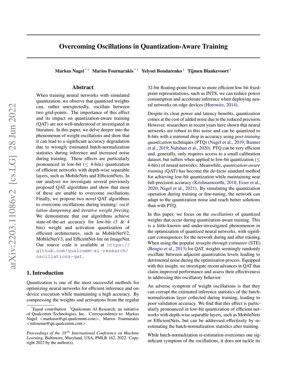 When training neural networks with simulated quantization, we observe that quantized weights can, rather unexpectedly, oscillate between two grid-points. The importance of this effect and its impact on quantization-aware training (QAT) are not well-understood or investigated in literature. In this paper, we delve deeper into the phenomenon of weight oscillations and show that it can lead to a significant accuracy degradation due to wrongly estimated batch-normalization statistics during inference and increased noise during training. These effects are particularly pronounced in low-bit ( 4-bits) quantization of efficient networks with depth-wise separable layers, such as MobileNets and EfficientNets. In our analysis we investigate several previously proposed QAT algorithms and show that most of these are unable to overcome oscillations. Finally, we propose two novel QAT algorithms to overcome oscillations during training: oscillation dampening and iterative weight freezing. We demonstrate that our algorithms achieve state-of-the-art accuracy for low-bit (3 & 4 bits) weight and activation quantization of efficient architectures, such as MobileNetV2, MobileNetV3, and EfficentNet-lite on ImageNet. Our source code is available at {https://github.com/qualcomm-ai-research/oscillations-qat}.