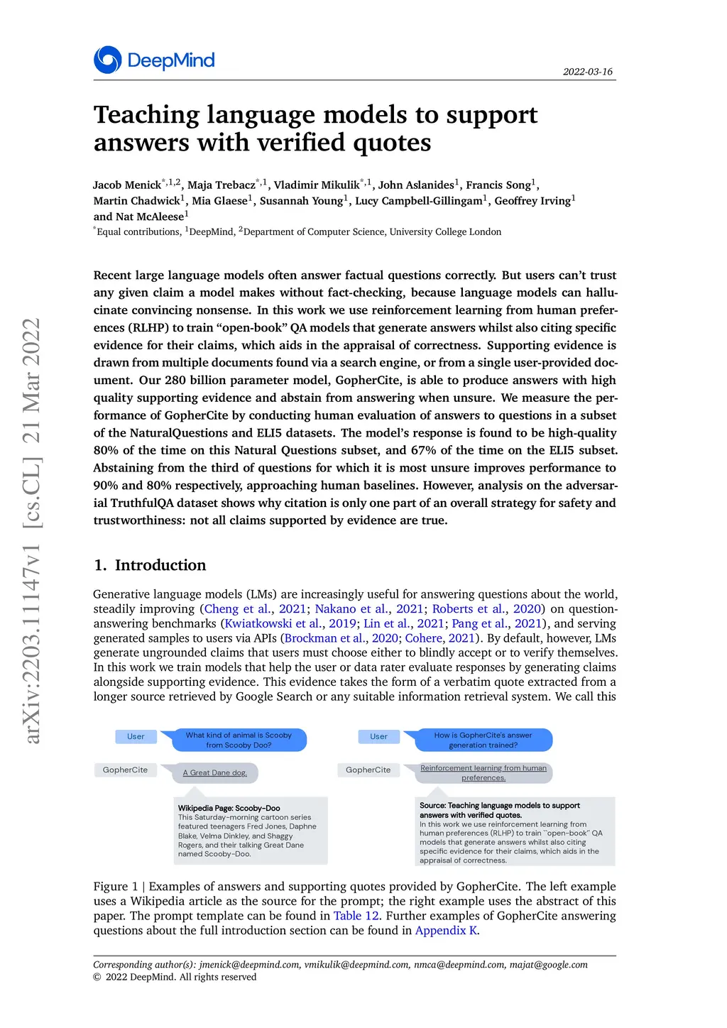 Recent large language models often answer factual questions correctly. But users can't trust any given claim a model makes without fact-checking, because language models can hallucinate convincing nonsense. In this work we use reinforcement learning from human preferences (RLHP) to train "open-book" QA models that generate answers whilst also citing specific evidence for their claims, which aids in the appraisal of correctness. Supporting evidence is drawn from multiple documents found via a search engine, or from a single user-provided document. Our 280 billion parameter model, GopherCite, is able to produce answers with high quality supporting evidence and abstain from answering when unsure. We measure the performance of GopherCite by conducting human evaluation of answers to questions in a subset of the NaturalQuestions and ELI5 datasets. The model's response is found to be high-quality 80\% of the time on this Natural Questions subset, and 67\% of the time on the ELI5 subset. Abstaining from the third of questions for which it is most unsure improves performance to 90\% and 80\% respectively, approaching human baselines. However, analysis on the adversarial TruthfulQA dataset shows why citation is only one part of an overall strategy for safety and trustworthiness: not all claims supported by evidence are true.