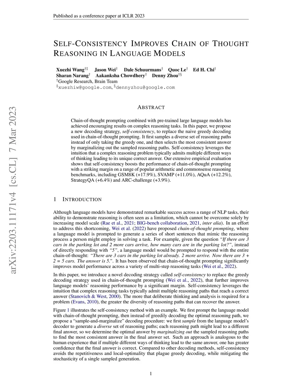 Chain-of-thought prompting combined with pre-trained large language models has achieved encouraging results on complex reasoning tasks. In this paper, we propose a new decoding strategy, self-consistency, to replace the naive greedy decoding used in chain-of-thought prompting. It first samples a diverse set of reasoning paths instead of only taking the greedy one, and then selects the most consistent answer by marginalizing out the sampled reasoning paths. Self-consistency leverages the intuition that a complex reasoning problem typically admits multiple different ways of thinking leading to its unique correct answer. Our extensive empirical evaluation shows that self-consistency boosts the performance of chain-of-thought prompting with a striking margin on a range of popular arithmetic and commonsense reasoning benchmarks, including GSM8K (+17.9%), SVAMP (+11.0%), AQuA (+12.2%), StrategyQA (+6.4%) and ARC-challenge (+3.9%).